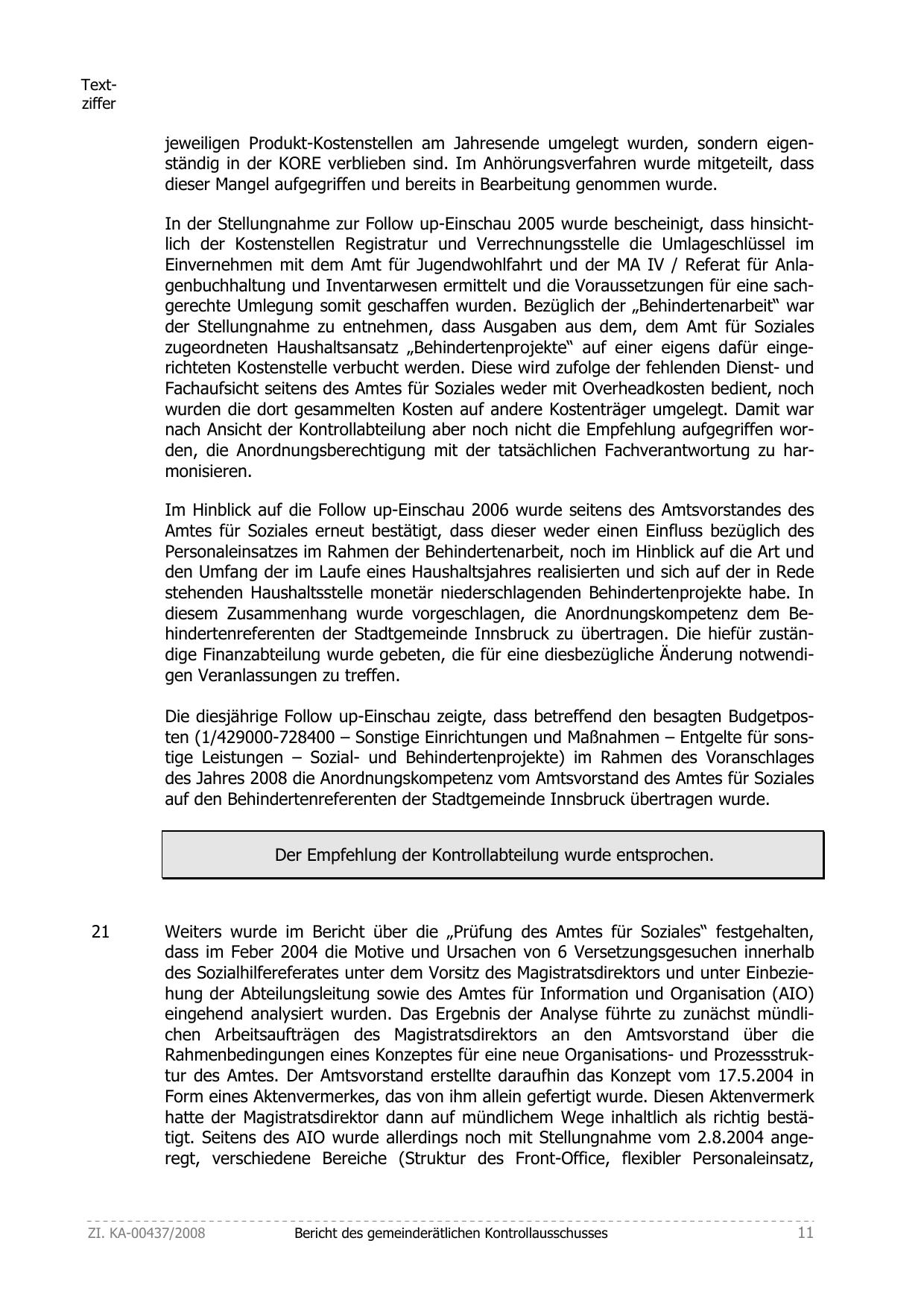 Die diesjährige Follow up-Einschau zeigte, dass betreffend den besagten Budgetposten (1/429000-728400 – Sonstige Einrichtungen und Maßnahmen – Entgelte für sonstige Leistungen – Sozial- und Behindertenprojekte) im Rahmen des Voranschlages
