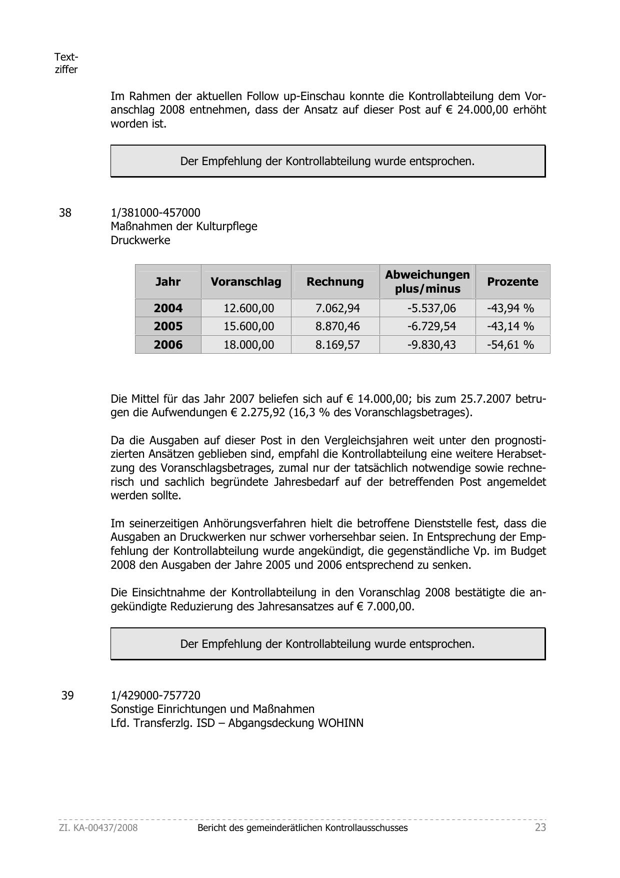Die Einsichtnahme der Kontrollabteilung in den Voranschlag 2008 bestätigte die angekündigte Reduzierung des Jahresansatzes auf € 7.000,00.