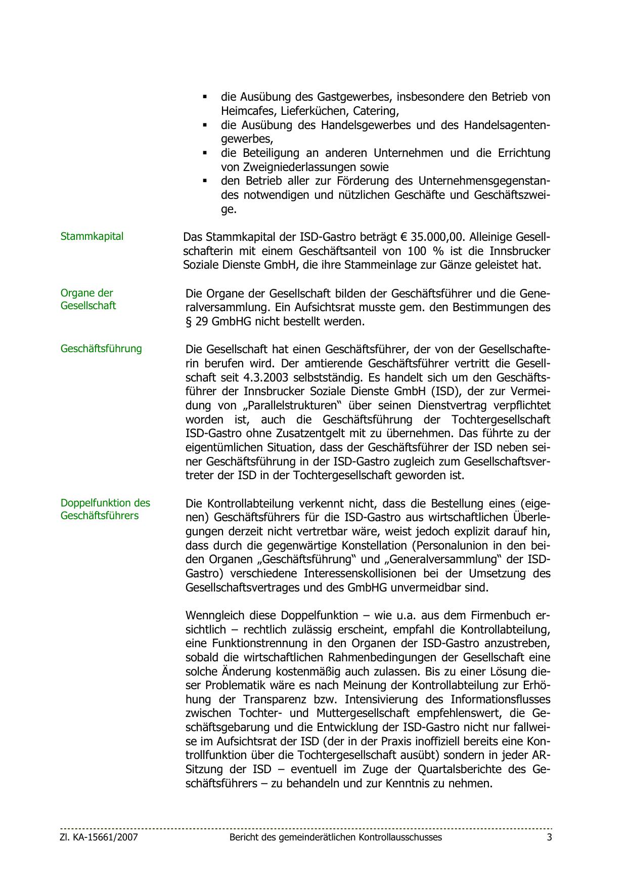Die Kontrollabteilung verkennt nicht, dass die Bestellung eines (eigenen) Geschäftsführers für die ISD-Gastro aus wirtschaftlichen Überlegungen derzeit nicht vertretbar wäre, weist jedoch explizit darauf hin,