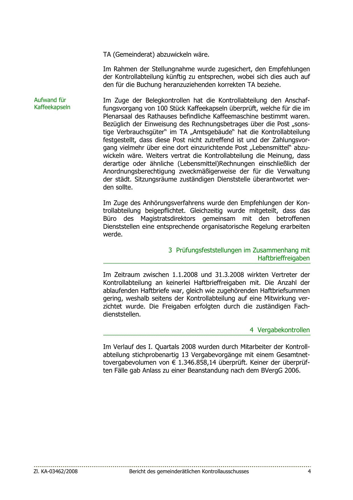 Im Verlauf des I. Quartals 2008 wurden durch Mitarbeiter der Kontrollabteilung stichprobenartig 13 Vergabevorgänge mit einem Gesamtnettovergabevolumen von € 1.346.858,14 überprüft. Keiner der überprüften Fälle gab Anlass zu einer Beanstandung nach dem BVergG 2006.