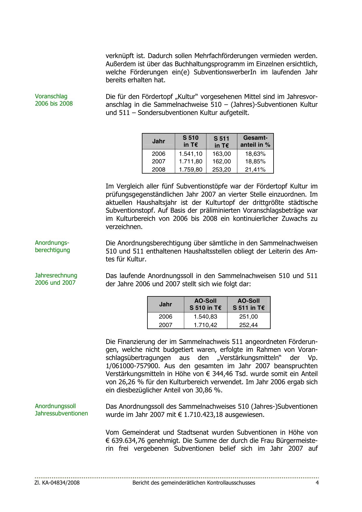 € 639.634,76 genehmigt. Die Summe der durch die Frau Bürgermeisterin frei vergebenen Subventionen belief sich im Jahr 2007 auf