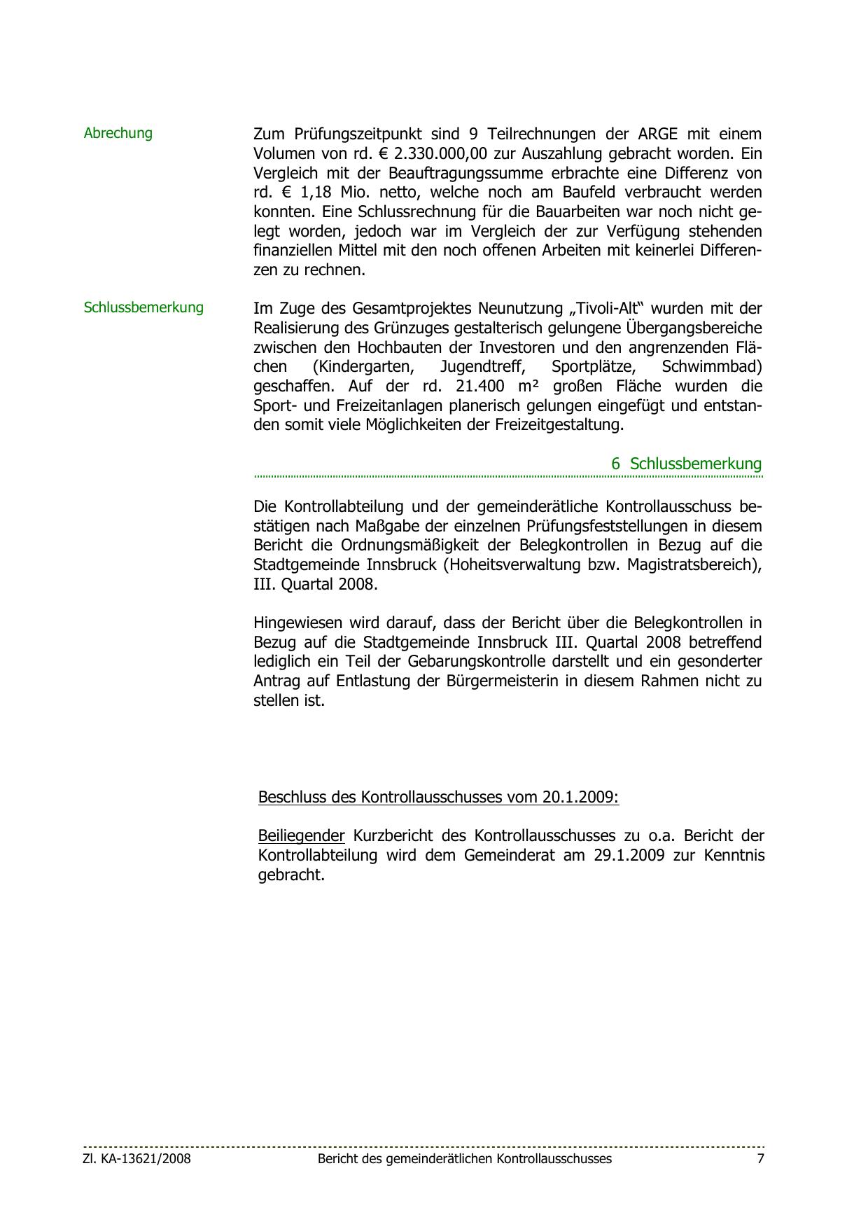 Kontrollabteilung wird dem Gemeinderat am 29.1.2009 zur Kenntnis