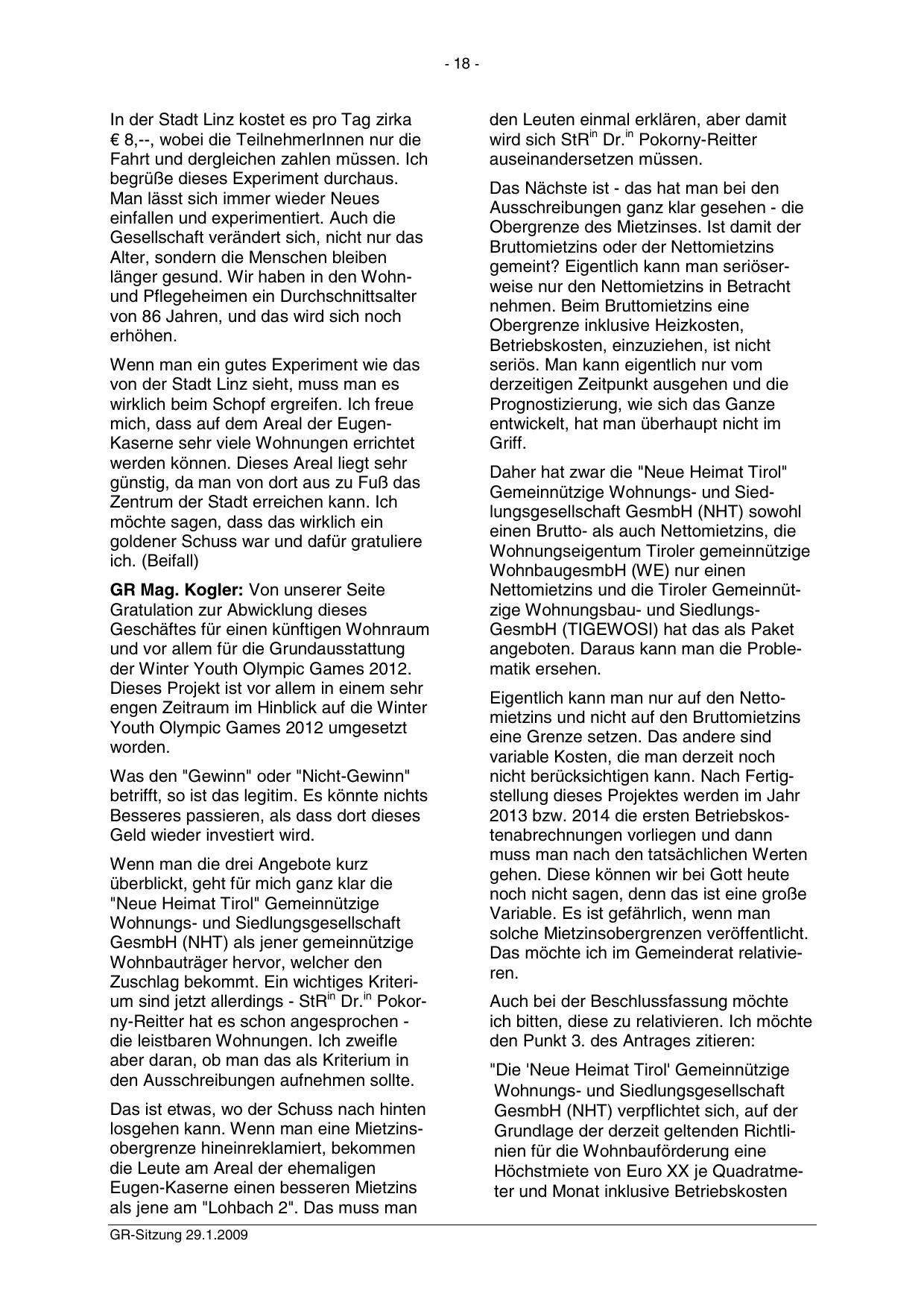 Zuschlag bekommt. Ein wichtiges Kriterium sind jetzt allerdings - StRin Dr.in Pokorny-Reitter hat es schon angesprochen die leistbaren Wohnungen. Ich zweifle