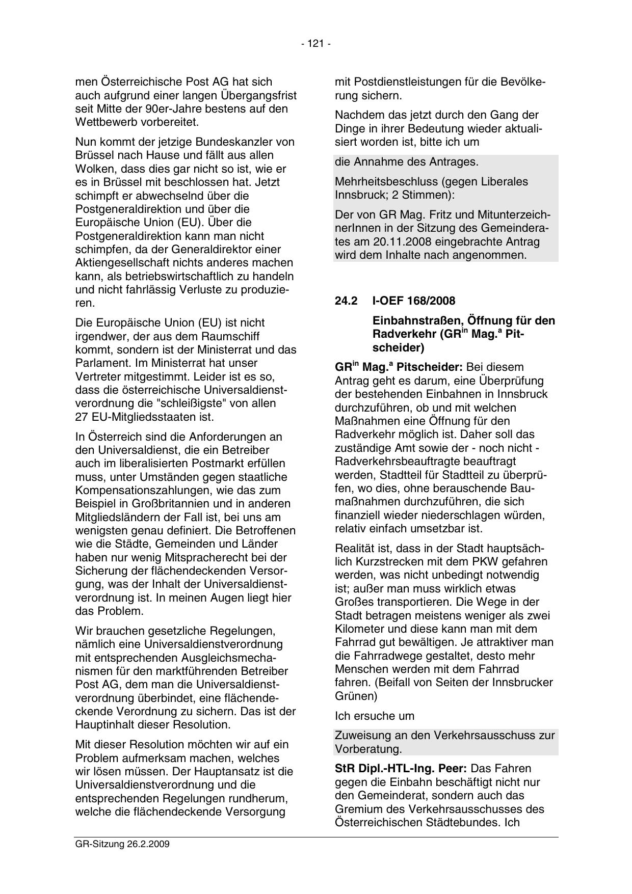 Der von GR Mag. Fritz und MitunterzeichnerInnen in der Sitzung des Gemeinderates am 20.11.2008 eingebrachte Antrag