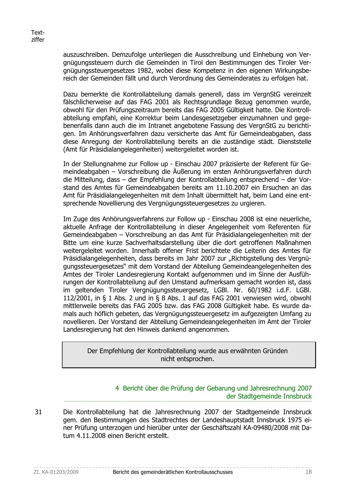 gem. den Bestimmungen des Stadtrechtes der Landeshauptstadt Innsbruck 1975 einer Prüfung unterzogen und hierüber unter der Geschäftszahl KA-09480/2008 mit Datum 4.11.2008 einen Bericht erstellt.