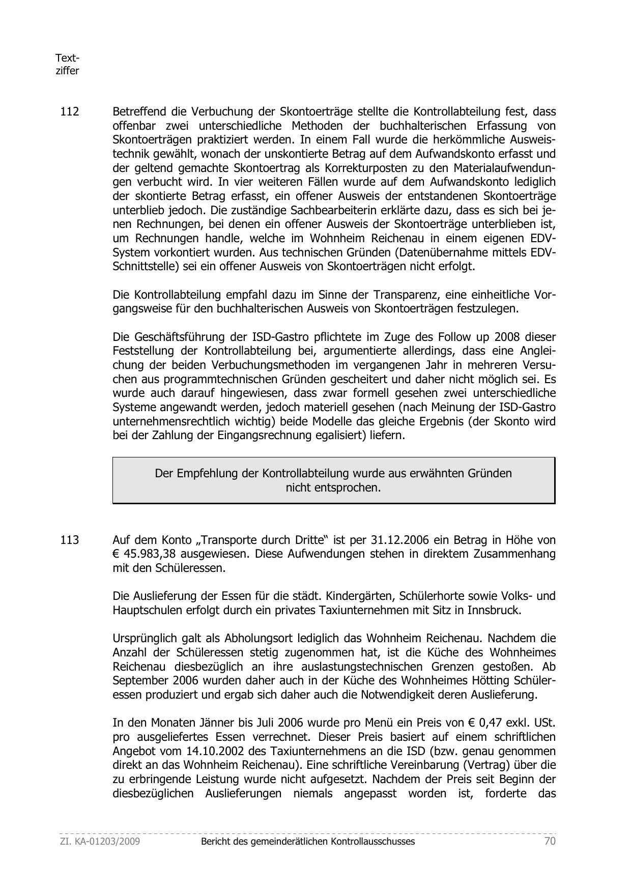 Die Kontrollabteilung empfahl dazu im Sinne der Transparenz, eine einheitliche Vorgangsweise für den buchhalterischen Ausweis von Skontoerträgen festzulegen.