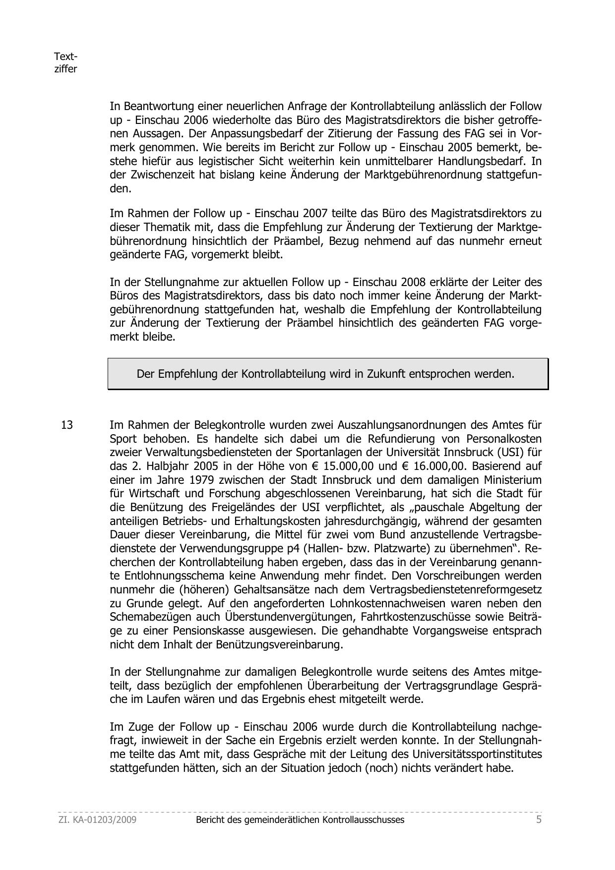 Im Zuge der Follow up - Einschau 2006 wurde durch die Kontrollabteilung nachgefragt, inwieweit in der Sache ein Ergebnis erzielt werden konnte. In der Stellungnahme teilte das Amt mit, dass Gespräche mit der Leitung des Universitätssportinstitutes