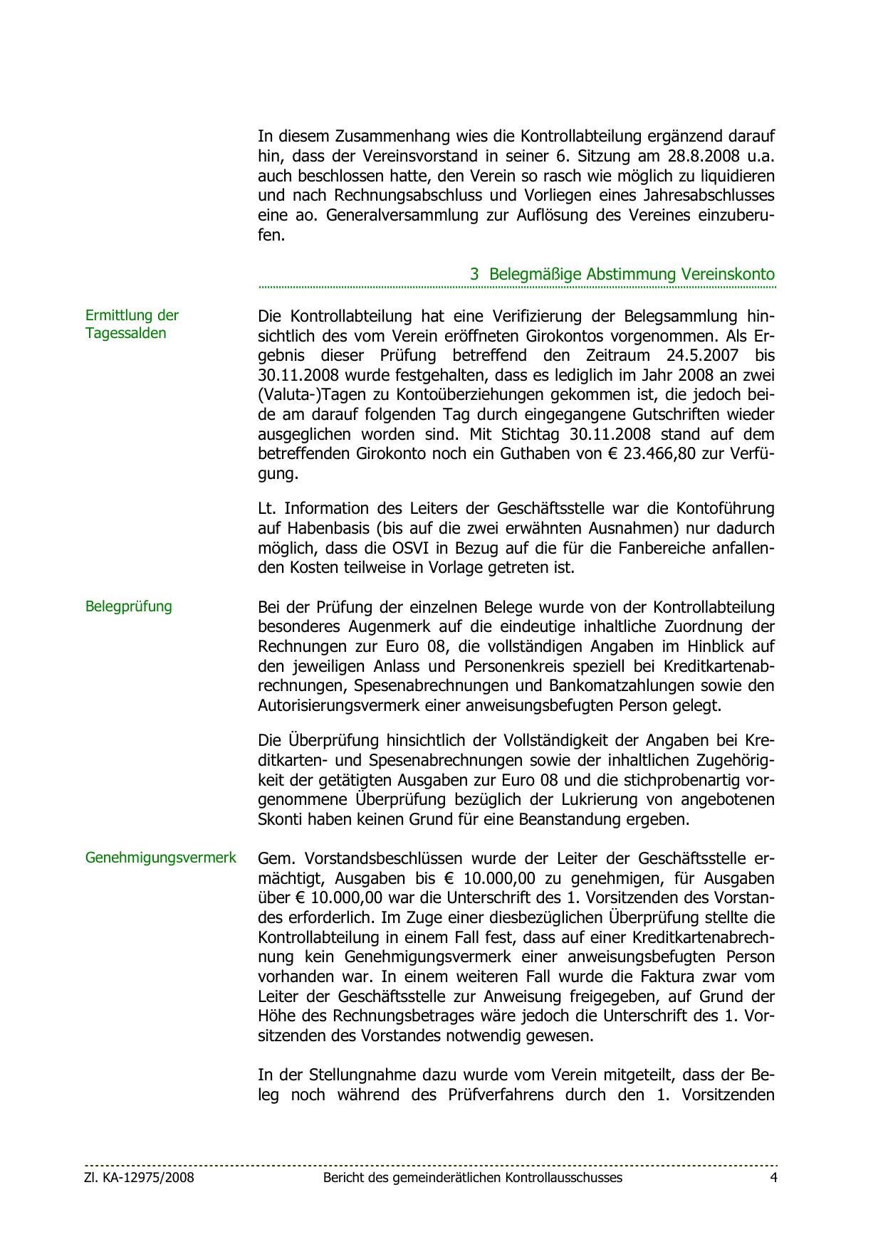 Die Kontrollabteilung hat eine Verifizierung der Belegsammlung hinsichtlich des vom Verein eröffneten Girokontos vorgenommen. Als Ergebnis dieser Prüfung betreffend den Zeitraum 24.5.2007 bis