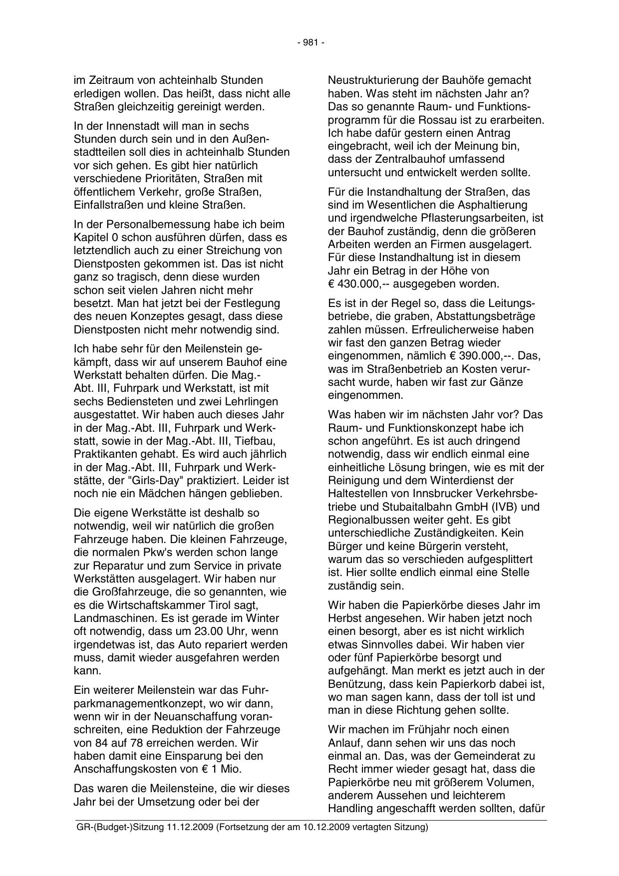 GR-(Budget-)Sitzung 11.12.2009 (Fortsetzung der am 10.12.2009 vertagten Sitzung)
