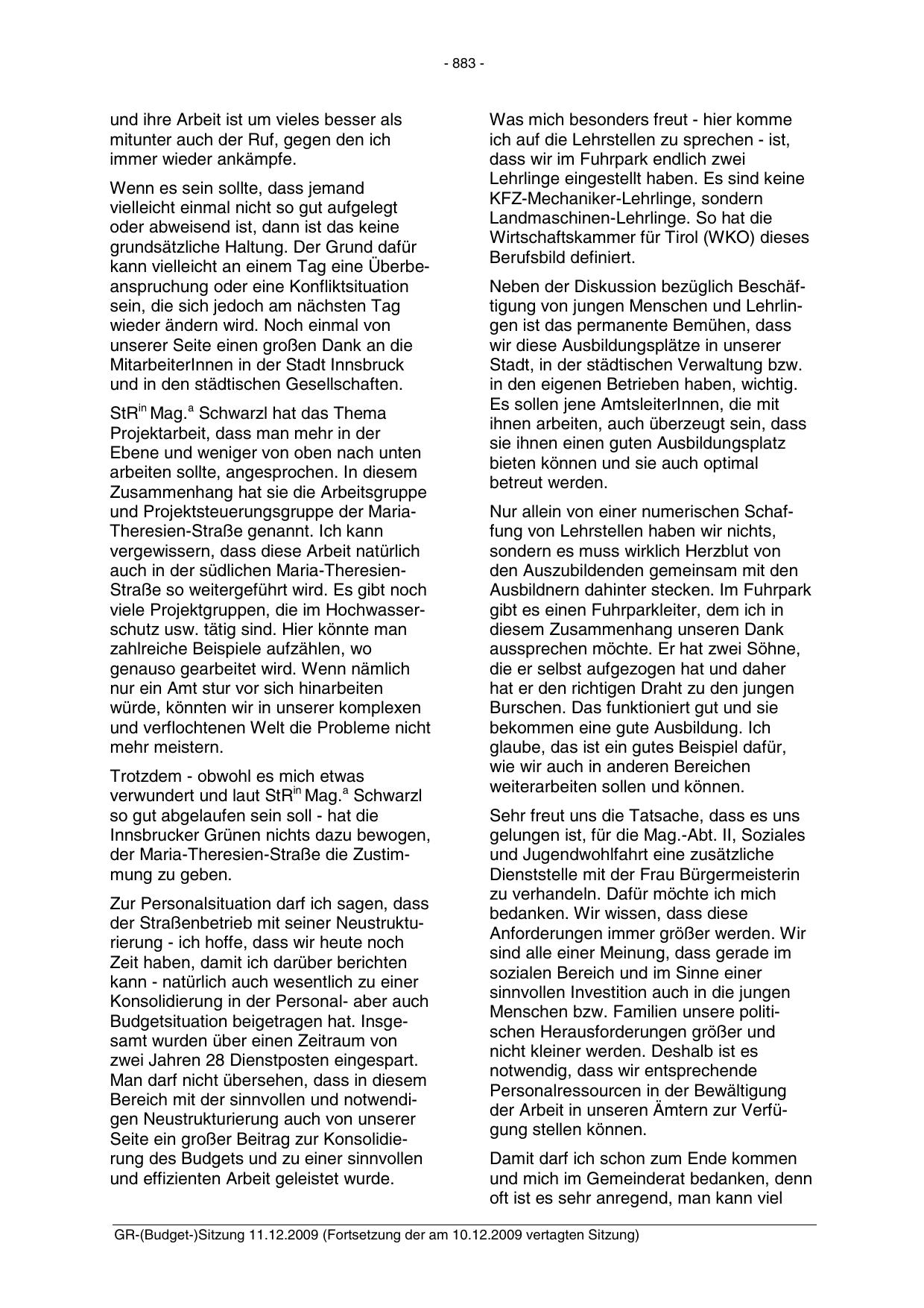 GR-(Budget-)Sitzung 11.12.2009 (Fortsetzung der am 10.12.2009 vertagten Sitzung)