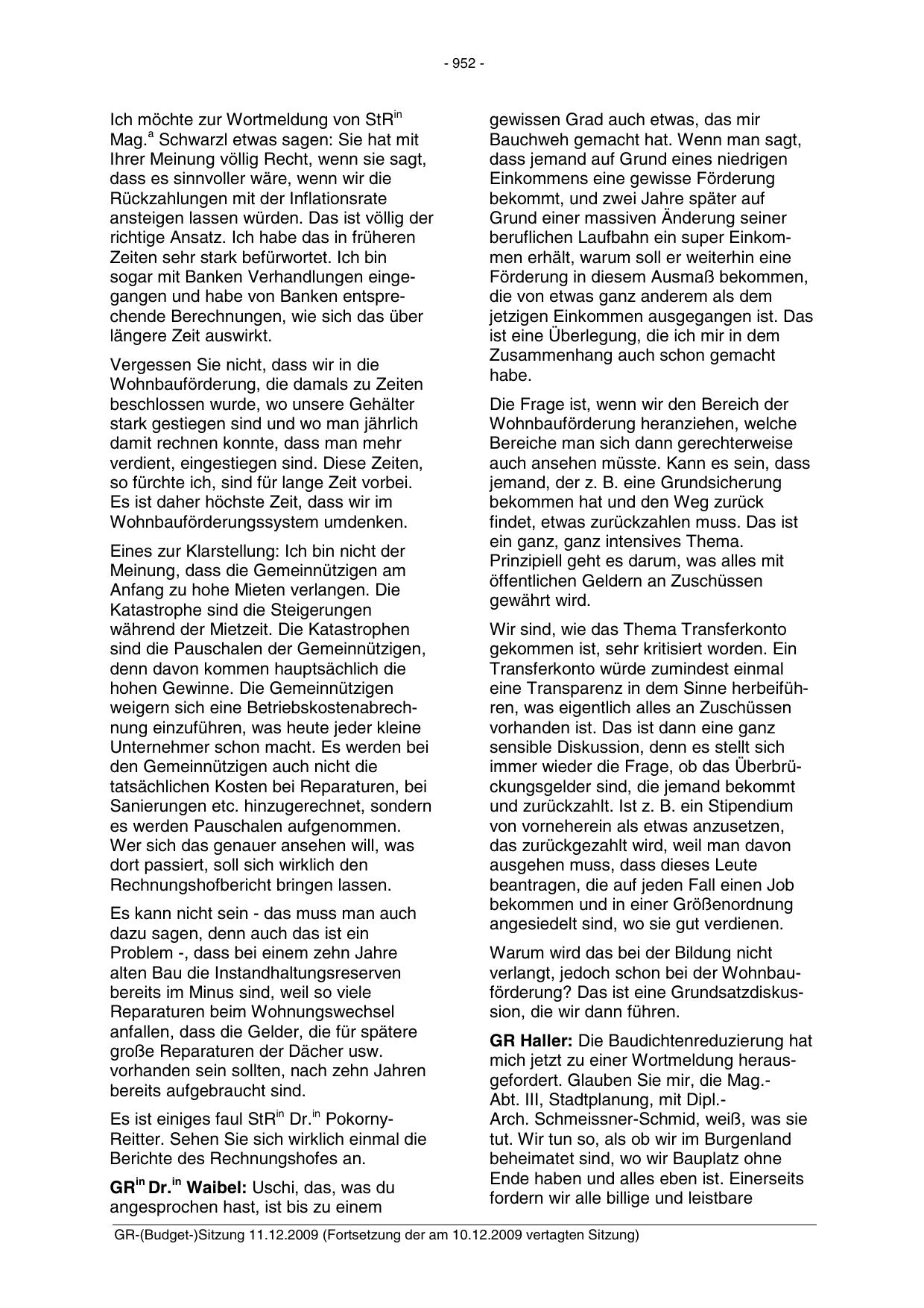 GR-(Budget-)Sitzung 11.12.2009 (Fortsetzung der am 10.12.2009 vertagten Sitzung)