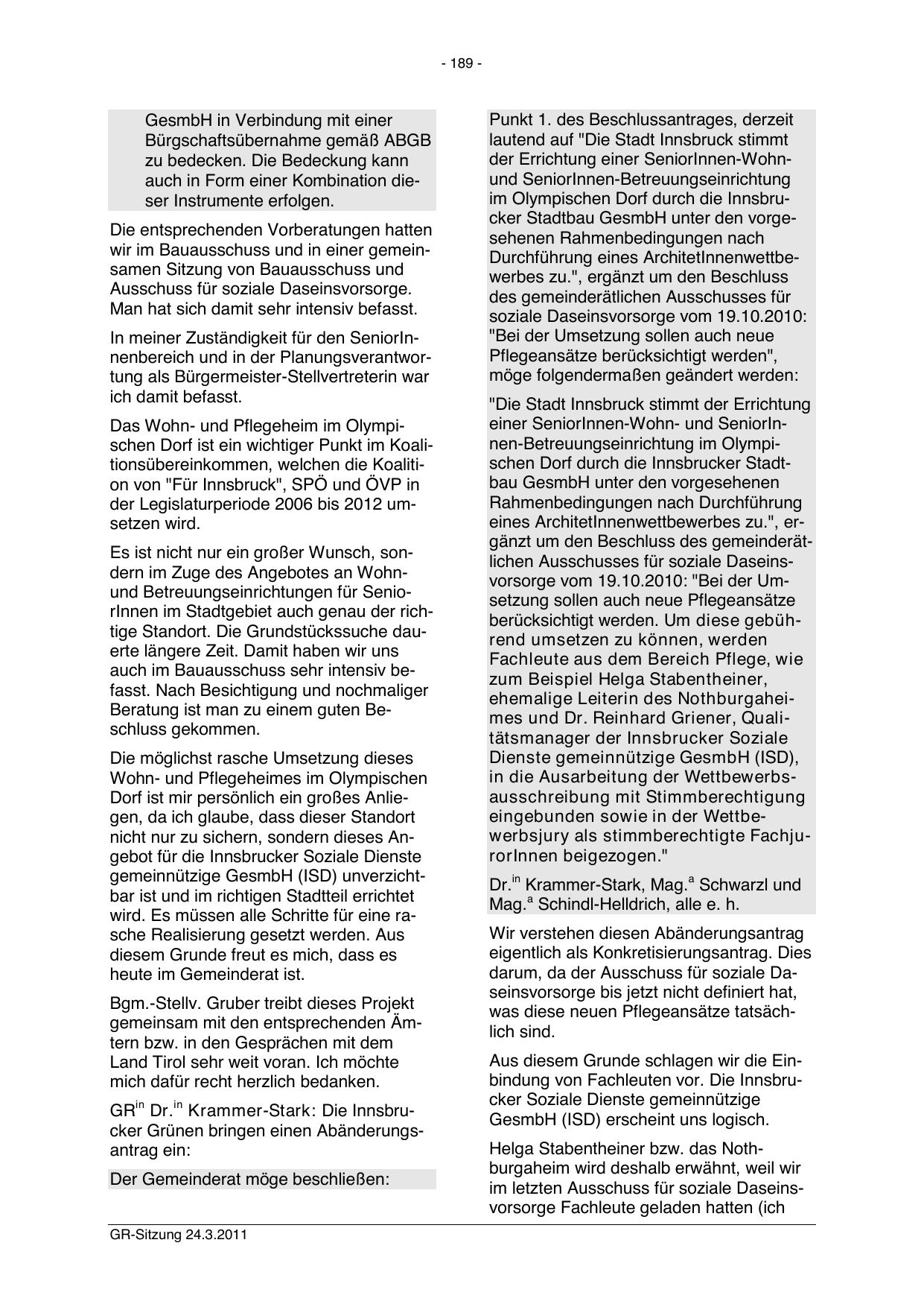 eines ArchitetInnenwettbewerbes zu.", ergänzt um den Beschluss des gemeinderätlichen Ausschusses für soziale Daseinsvorsorge vom 19.10.2010: "Bei der Umsetzung sollen auch neue Pflegeansätze