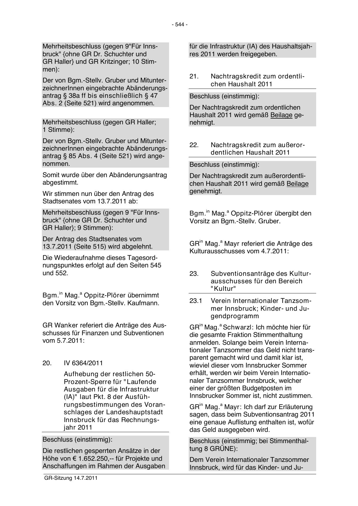 Mehrheitsbeschluss (gegen 9 "Für Innsbruck" {ohne GR Dr. Schuchter und