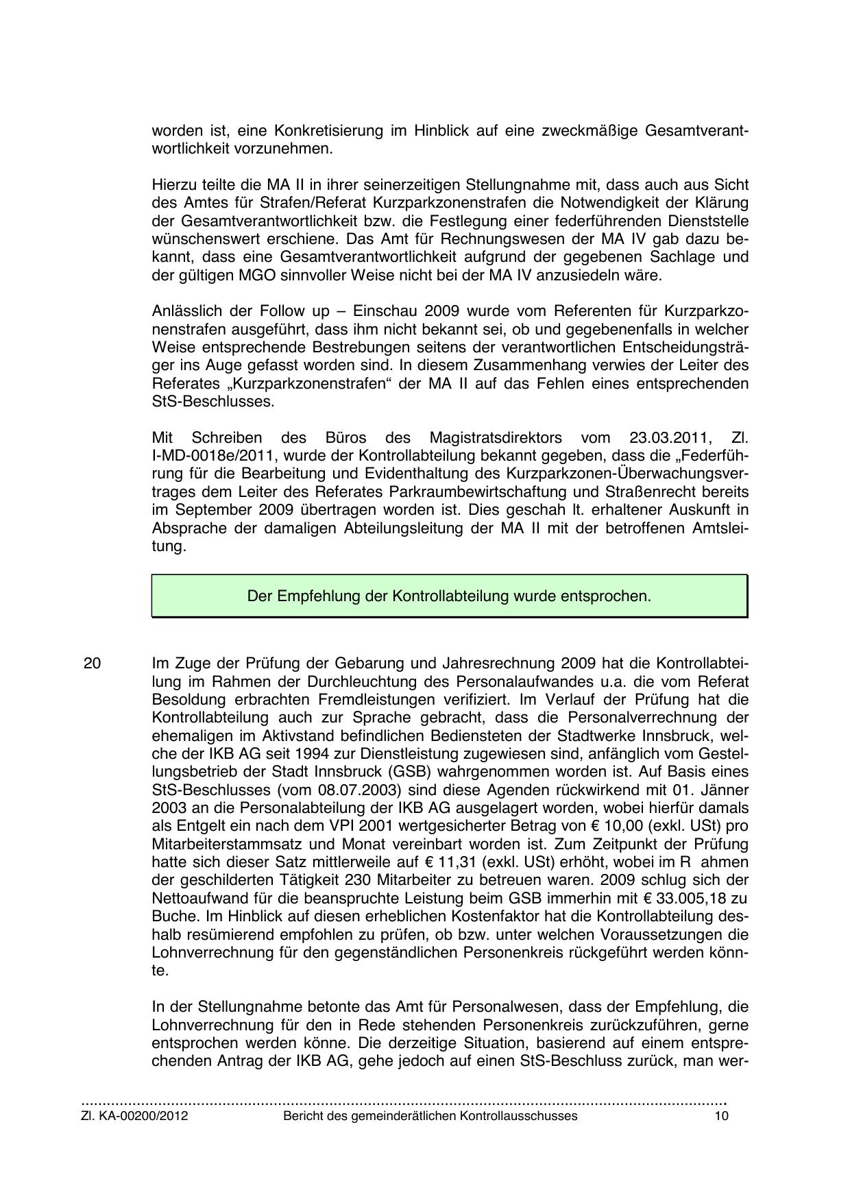 Im Zuge der Prüfung der Gebarung und Jahresrechnung 2009 hat die Kontrollabteilung im Rahmen der Durchleuchtung des Personalaufwandes u.a. die vom Referat