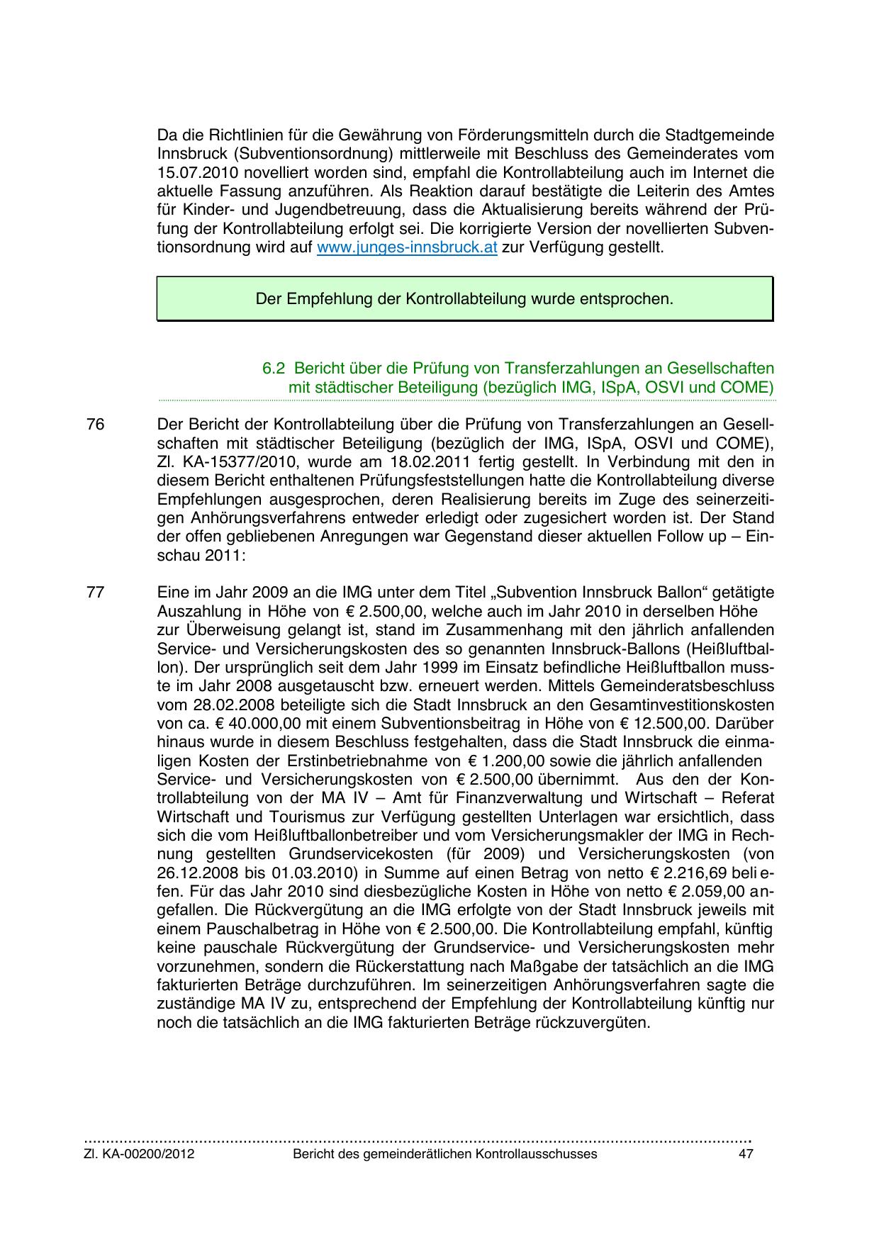 für Kinder- und Jugendbetreuung, dass die Aktualisierung bereits während der Prüfung der Kontrollabteilung erfolgt sei. Die korrigierte Version der novellierten Subventionsordnung wird auf www.junges-innsbruck.at zur Verfügung gestellt.