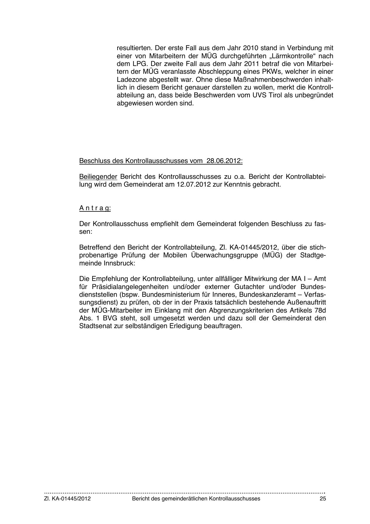Betreffend den Bericht der Kontrollabteilung, Zl. KA-01445/2012, über die stichprobenartige Prüfung der Mobilen Überwachungsgruppe (MÜG) der Stadtgemeinde Innsbruck: