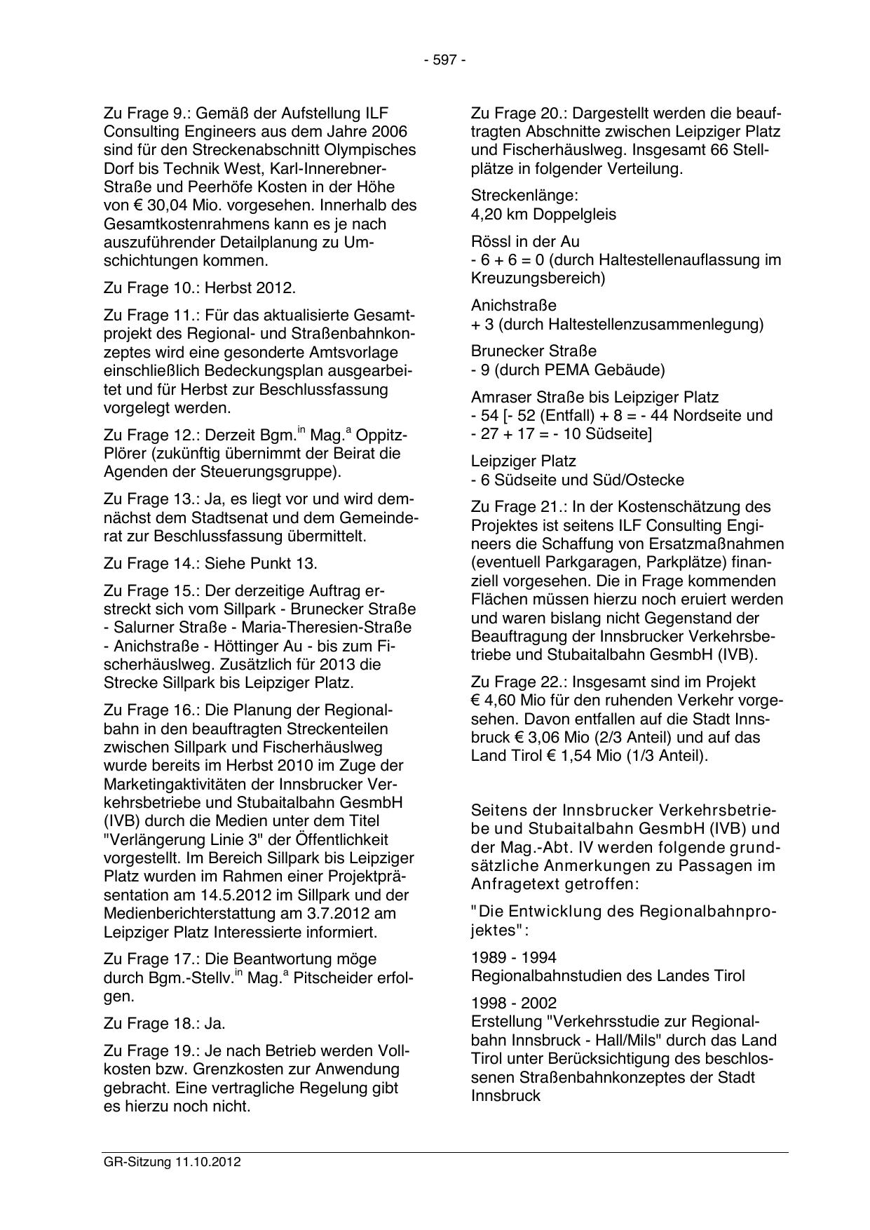 Zu Frage 11.: Für das aktualisierte Gesamtprojekt des Regional- und Straßenbahnkonzeptes wird eine gesonderte Amtsvorlage