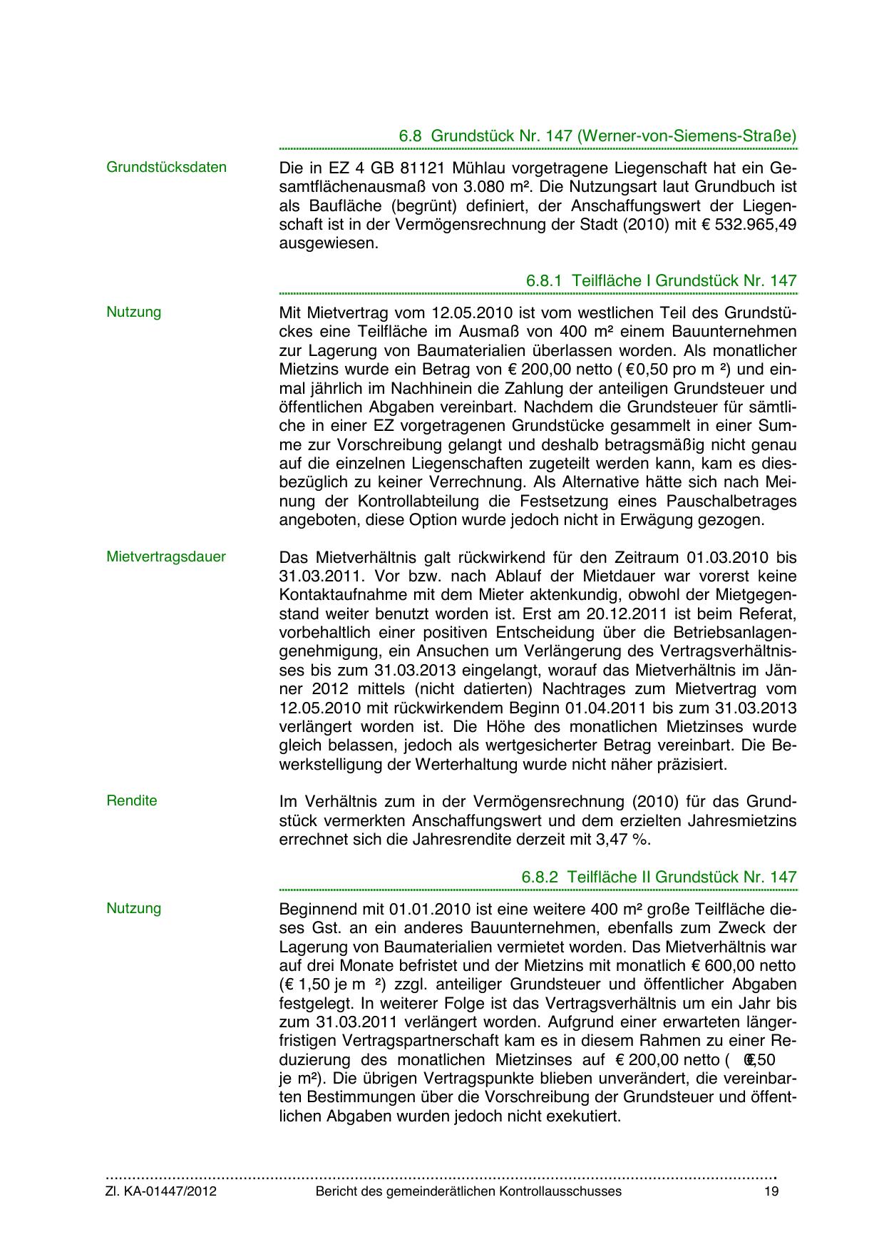 als Baufläche (begrünt) definiert, der Anschaffungswert der Liegenschaft ist in der Vermögensrechnung der Stadt (2010) mit € 532.965,49