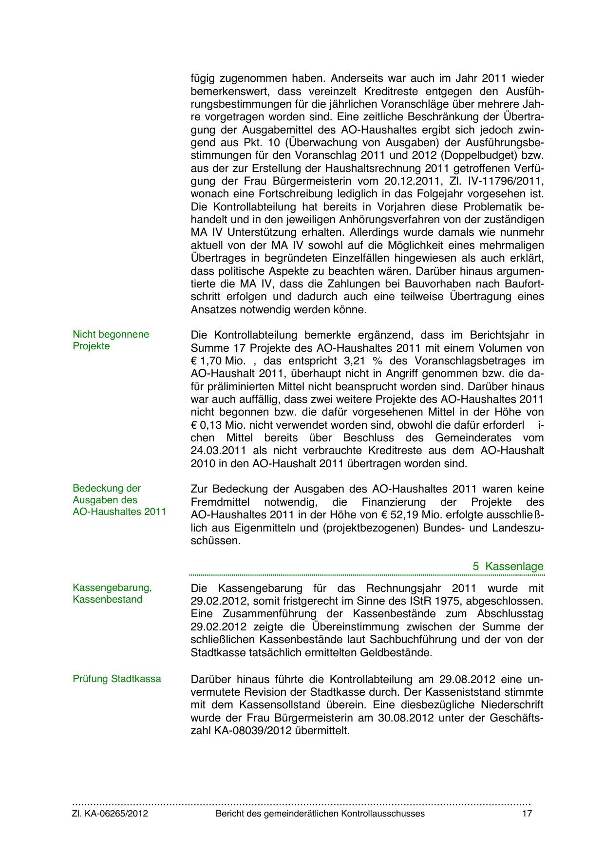 aus der zur Erstellung der Haushaltsrechnung 2011 getroffenen Verfügung der Frau Bürgermeisterin vom 20.12.2011, Zl. IV-11796/2011,