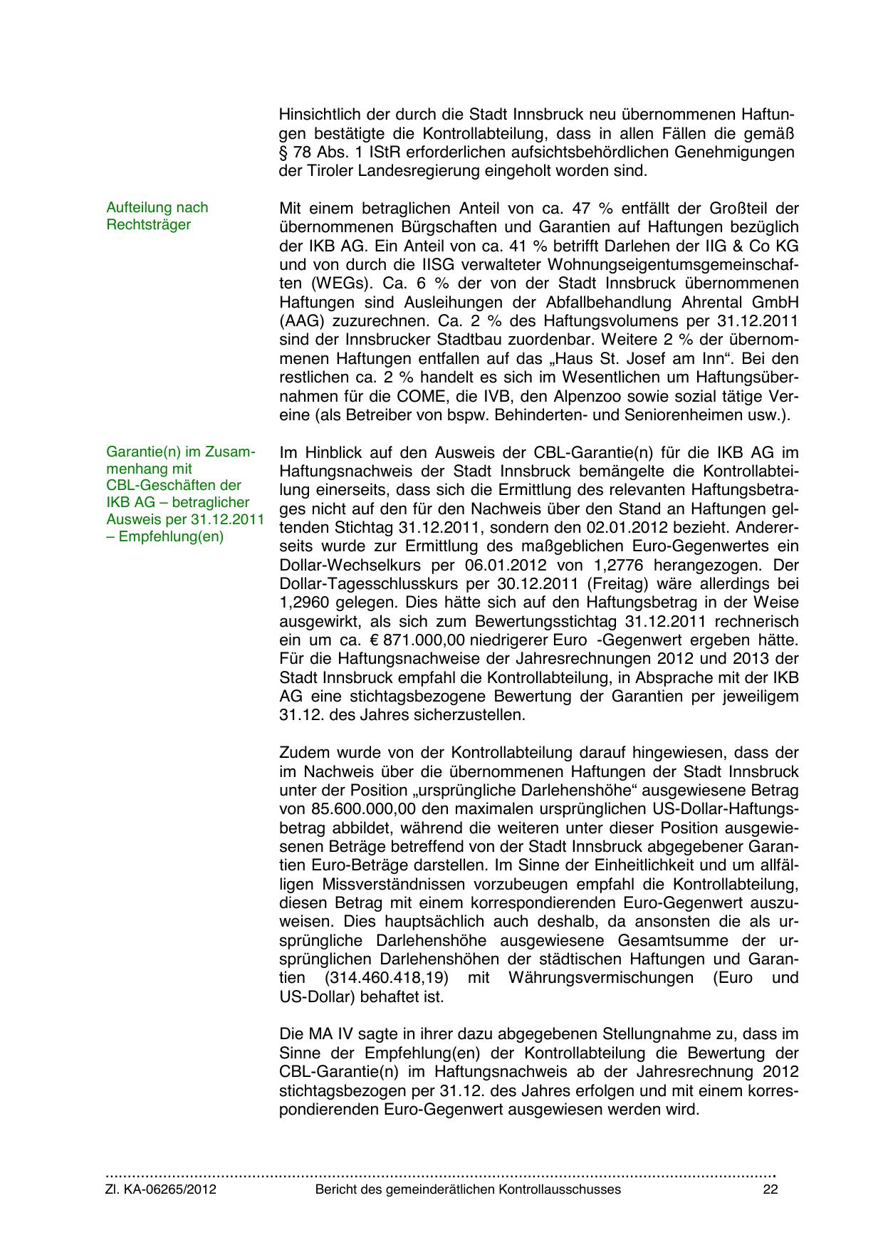 von 85.600.000,00 den maximalen ursprünglichen US-Dollar-Haftungsbetrag abbildet, während die weiteren unter dieser Position ausgewiesenen Beträge betreffend von der Stadt Innsbruck abgegebener Garantien Euro-Beträge darstellen. Im Sinne der Einheitlichkeit und um allfälligen Missverständnissen vorzubeugen empfahl die Kontrollabteilung,