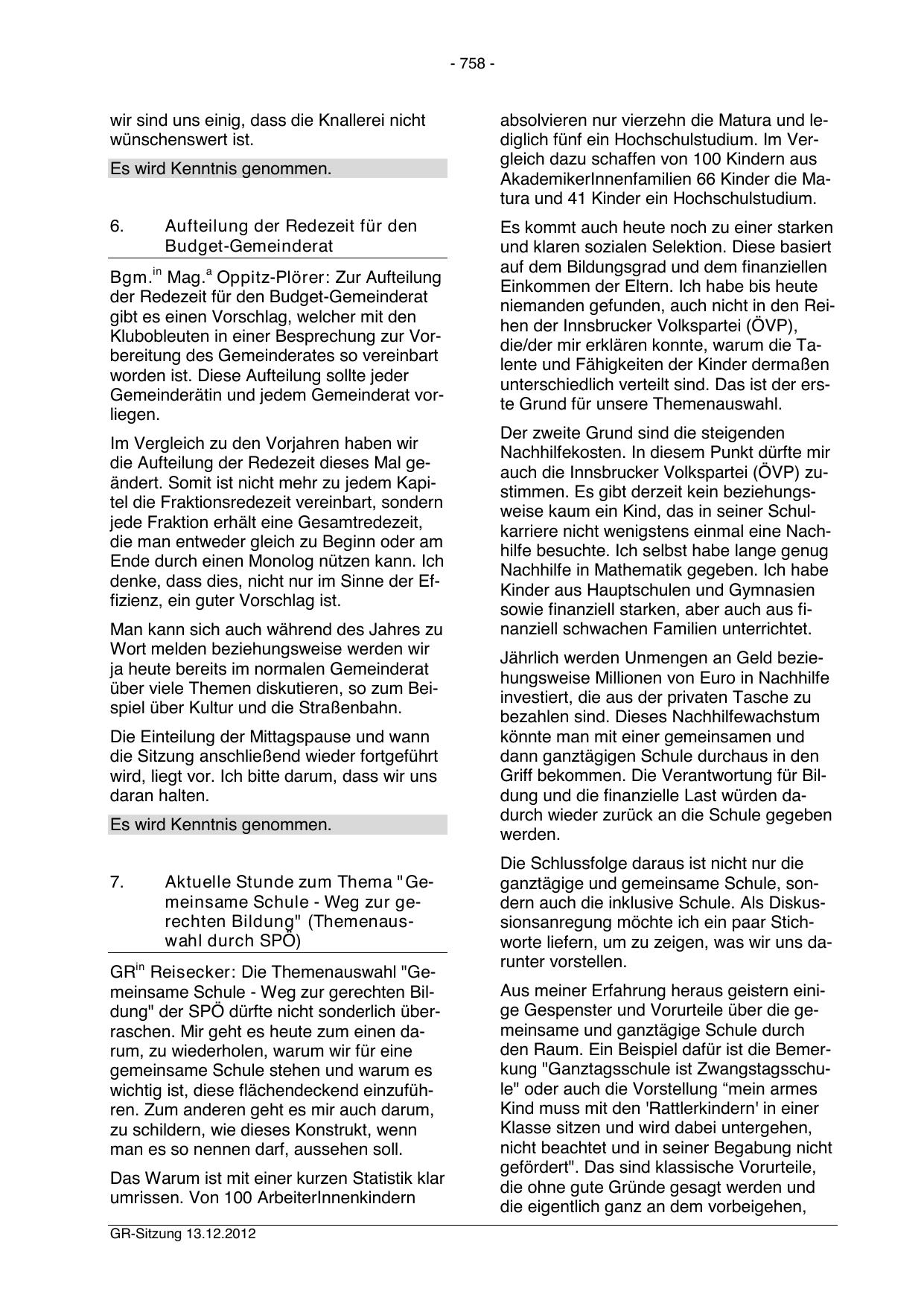 GRin Reisecker: Die Themenauswahl "Gemeinsame Schule - Weg zur gerechten Bildung" der SPÖ dürfte nicht sonderlich überraschen. Mir geht es heute zum einen darum, zu wiederholen, warum wir für eine