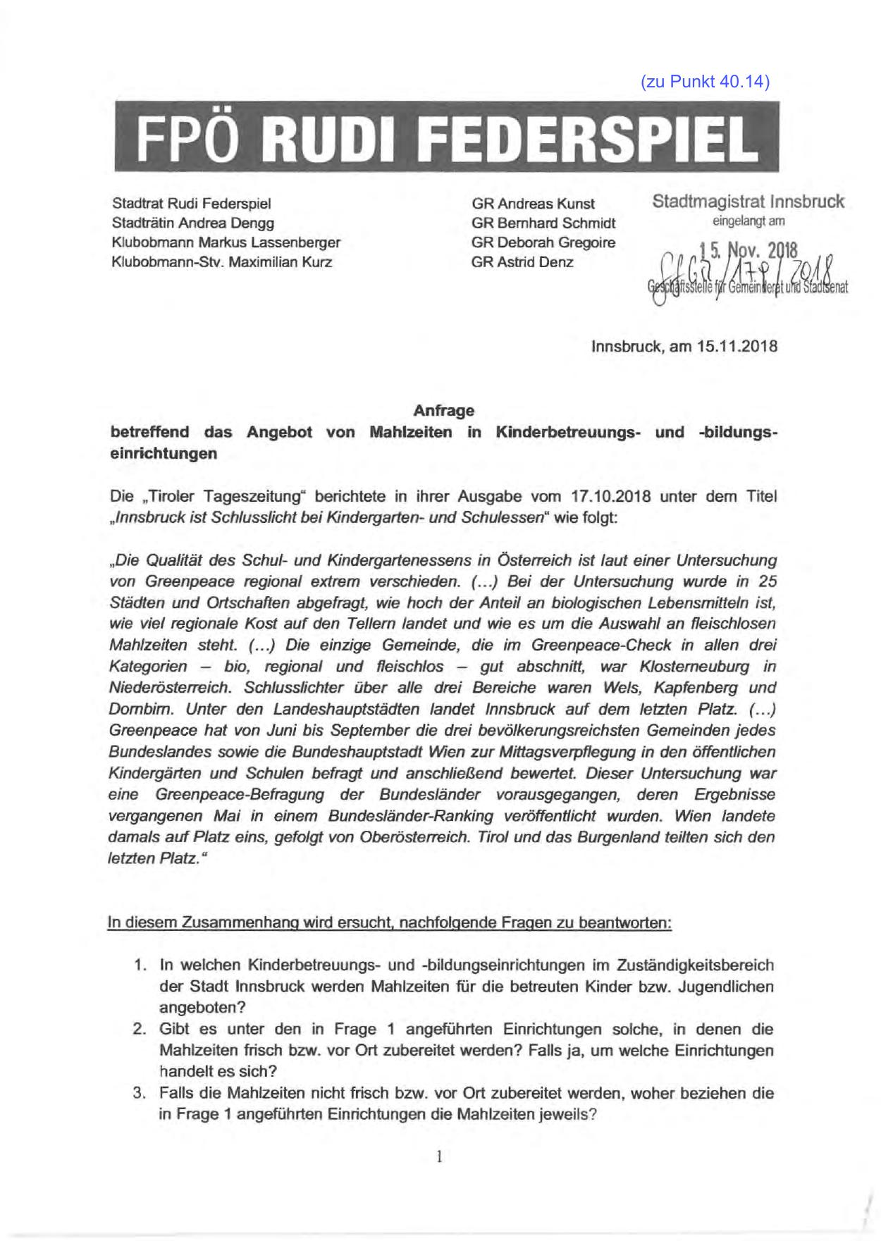 "Innsbruck ist Schlusslicht bei Kindergarten- und Schulessen" wie folgt: