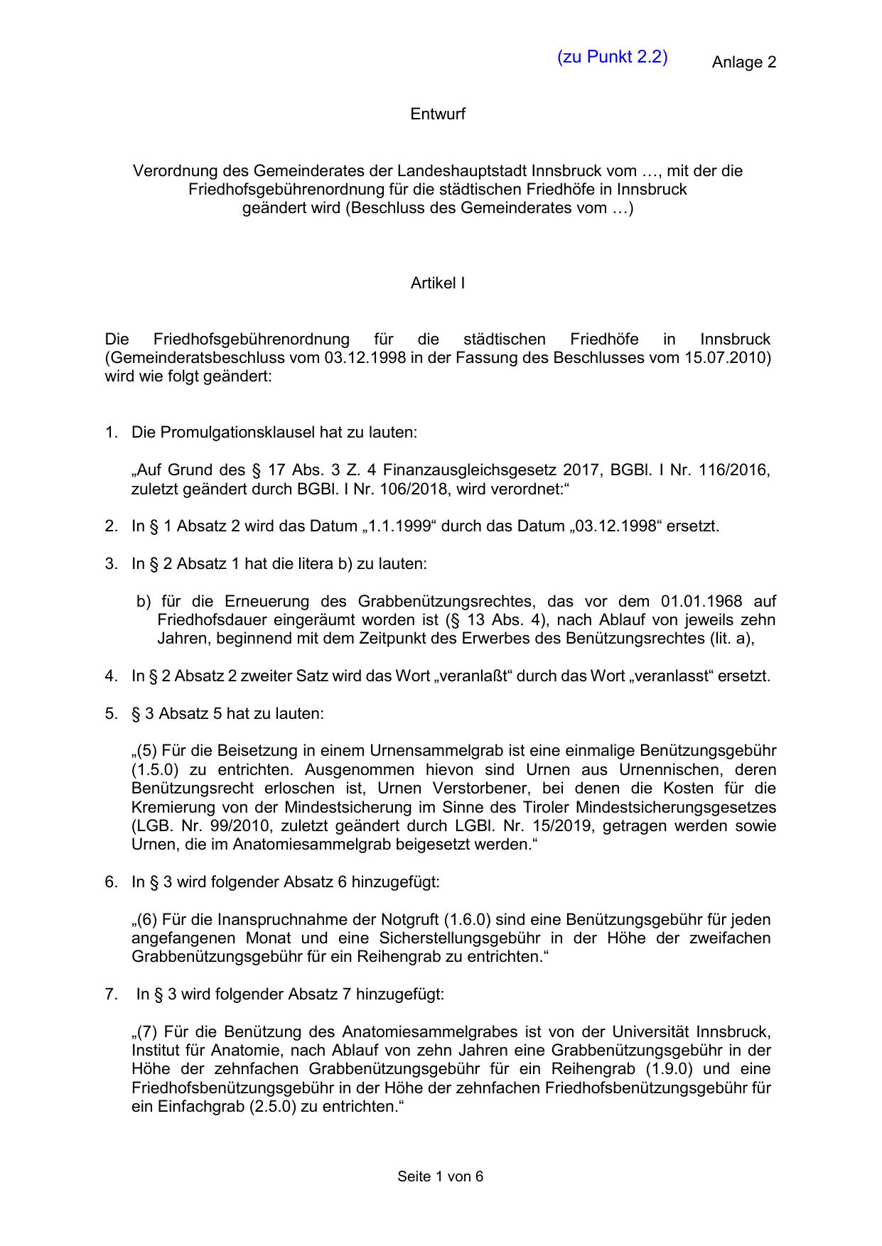 Friedhofsgebührenordnung für die städtischen Friedhöfe in Innsbruck