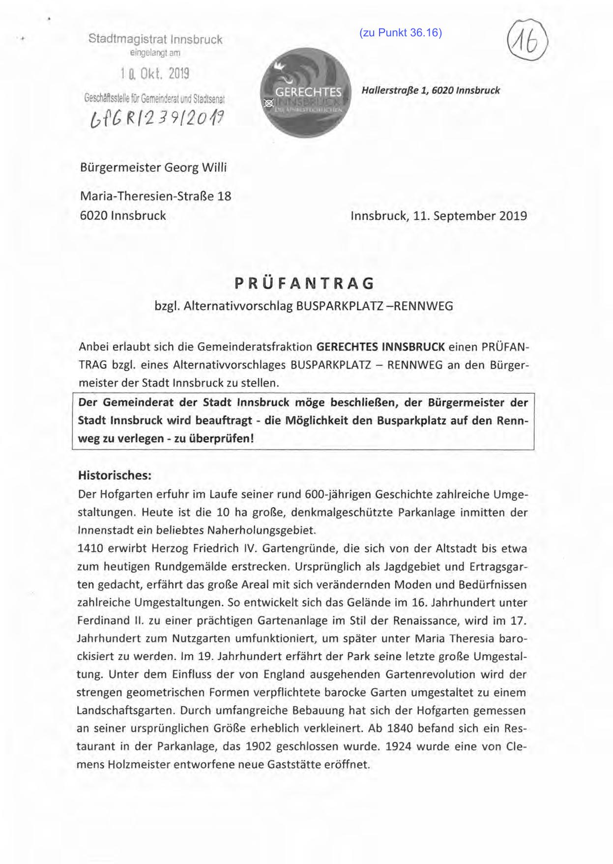Anbei erlaubt sich die Gemeinderatsfraktion GERECHTES INNSBRUCK einen PRÜFANTRAG bzgl. eines Alternativvorschlages BUSPARKPLATZ - RENNWEG an den Bürgermeister der Stadt Innsbruck zu stellen.