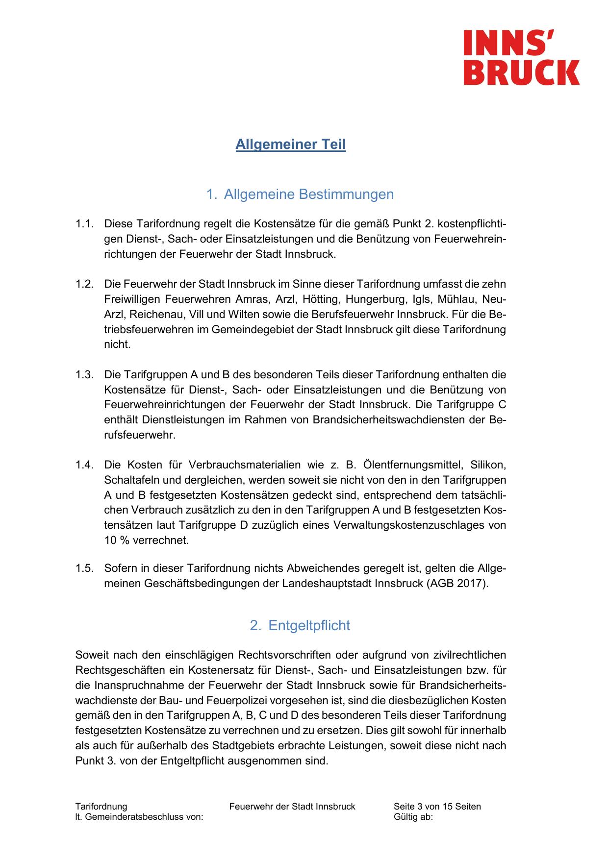 1.5. Sofern in dieser Tarifordnung nichts Abweichendes geregelt ist, gelten die Allgemeinen Geschäftsbedingungen der Landeshauptstadt Innsbruck (AGB 2017).