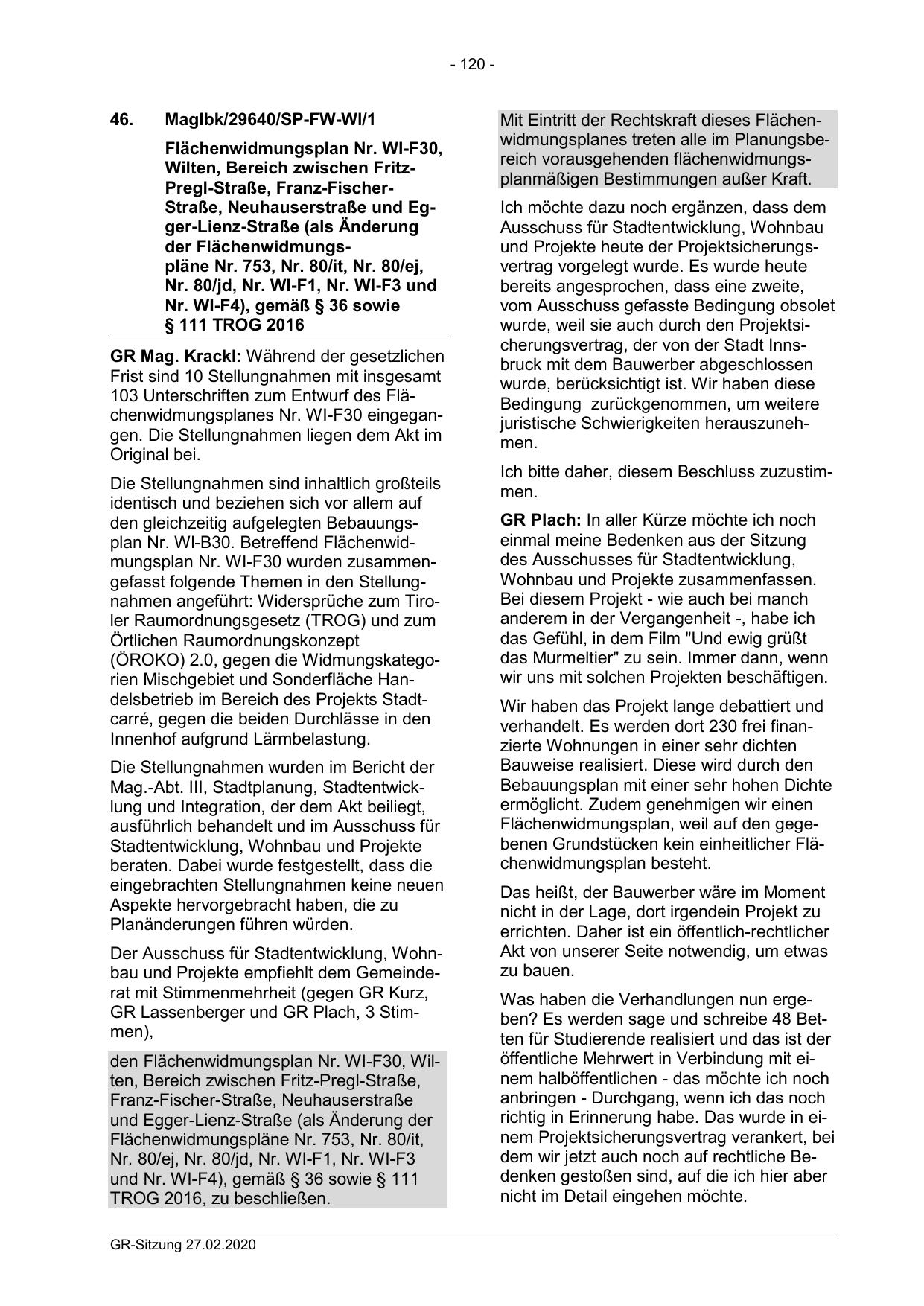 den gleichzeitig aufgelegten Bebauungsplan Nr. Wl-B30. Betreffend Flächenwidmungsplan Nr. WI-F30 wurden zusammengefasst folgende Themen in den Stellungnahmen angeführt: Widersprüche zum Tiroler Raumordnungsgesetz (TROG) und zum