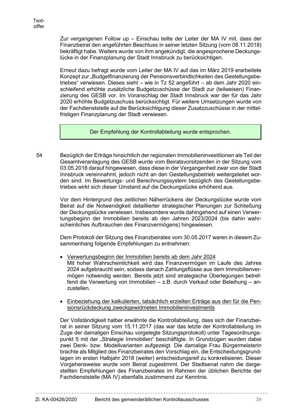 Konzept zur „Budgetfinanzierung der Pensionsverbindlichkeiten des Gestellungsbetriebes“ verwiesen. Dieses sieht – wie in Tz 52 angeführt – ab dem Jahr 2020 einschleifend erhöhte zusätzliche Budgetzuschüsse der Stadt zur (teilweisen) Finanzierung des GESB vor. Im Voranschlag der Stadt Innsbruck war der für das Jahr