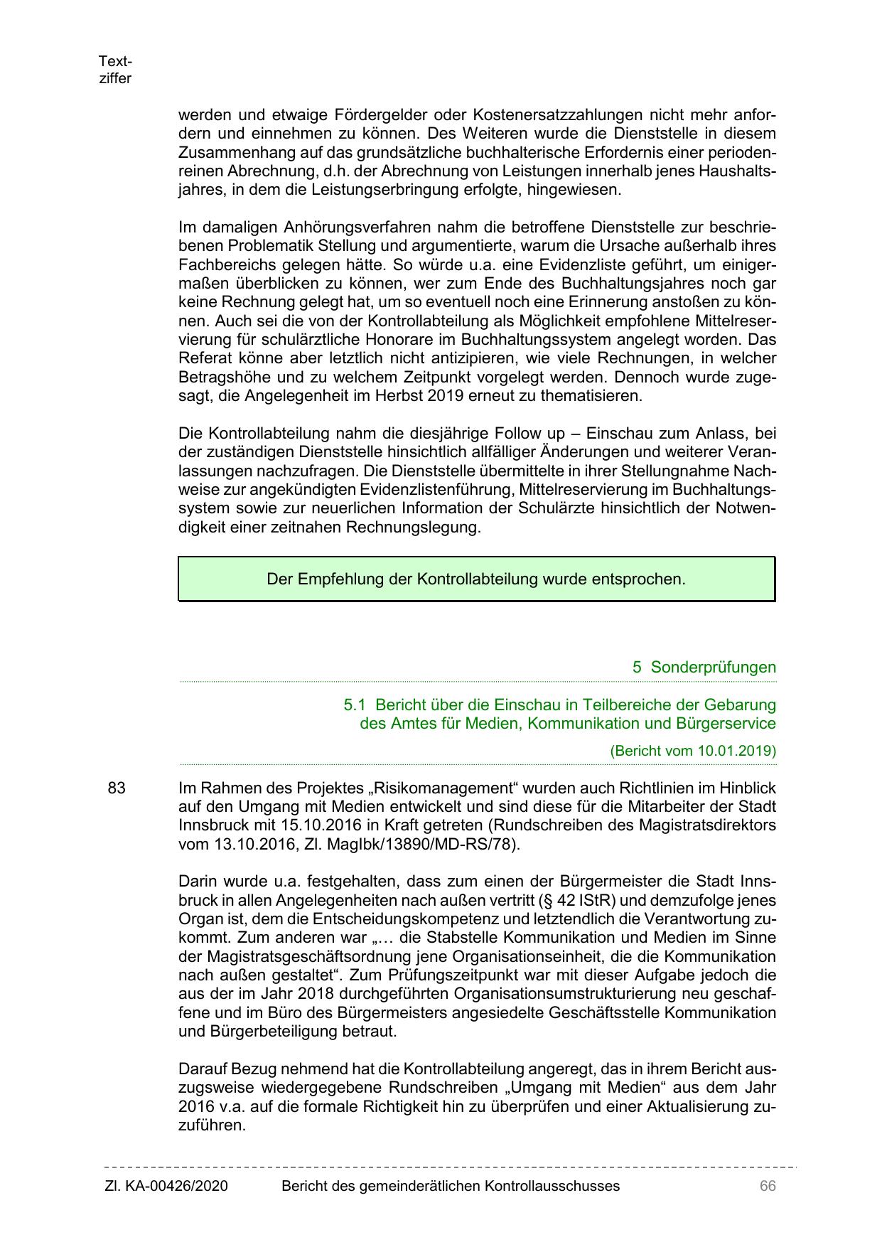 Darauf Bezug nehmend hat die Kontrollabteilung angeregt, das in ihrem Bericht auszugsweise wiedergegebene Rundschreiben „Umgang mit Medien“ aus dem Jahr