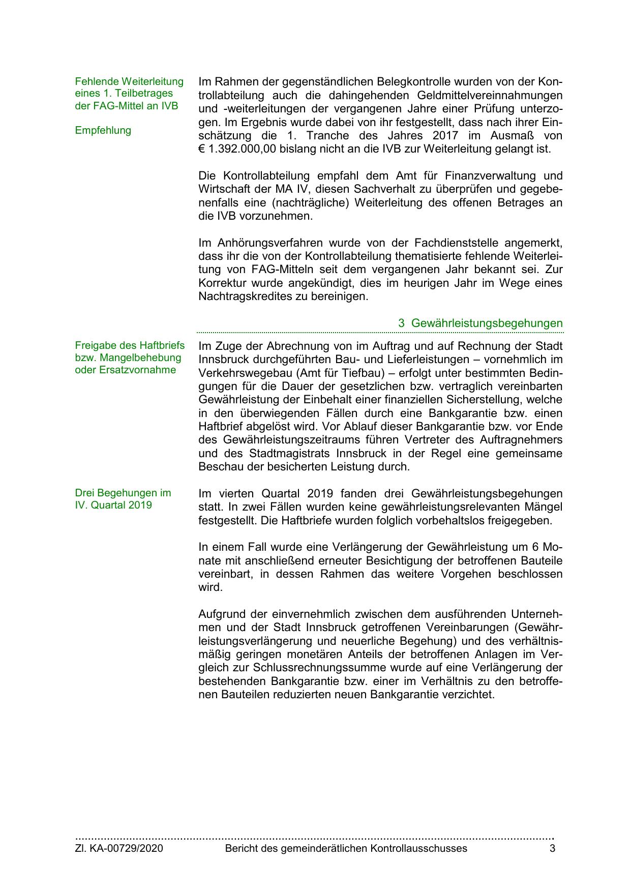 Aufgrund der einvernehmlich zwischen dem ausführenden Unternehmen und der Stadt Innsbruck getroffenen Vereinbarungen (Gewährleistungsverlängerung und neuerliche Begehung) und des verhältnismäßig geringen monetären Anteils der betroffenen Anlagen im Vergleich zur Schlussrechnungssumme wurde auf eine Verlängerung der