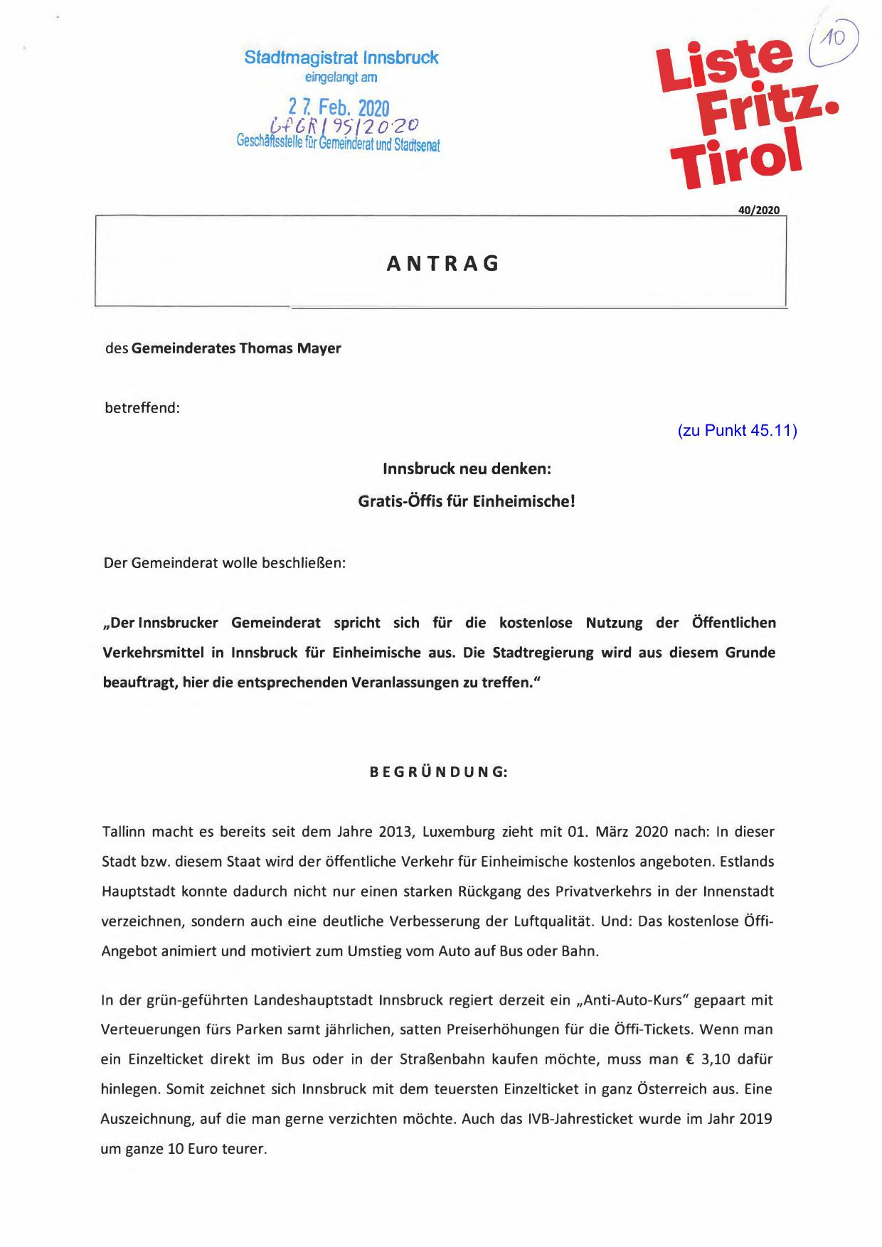 „Der lnnsbrucker Gemeinderat spricht sich für die kostenlose Nutzung der Öffentlichen