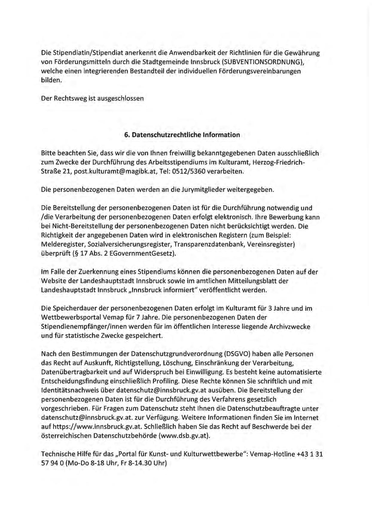 zum Zwecke der Durchführung des Arbeitsstipendiums im Kulturamt, Herzog-FriedrichStraße 21, post.kulturamt@magibk.at, Tel: 0512/5360 verarbeiten.