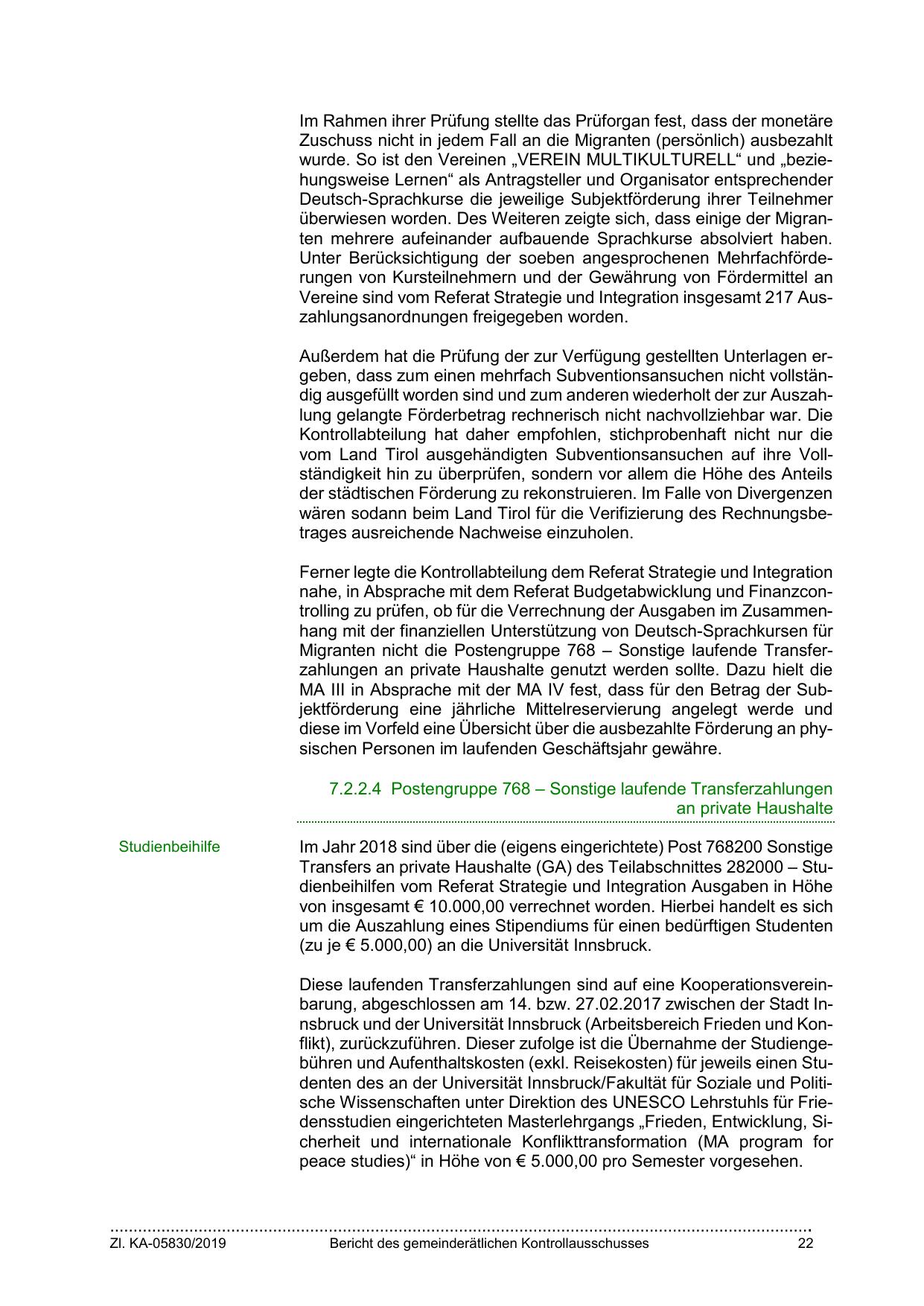Diese laufenden Transferzahlungen sind auf eine Kooperationsvereinbarung, abgeschlossen am 14. bzw. 27.02.2017 zwischen der Stadt Innsbruck und der Universität Innsbruck (Arbeitsbereich Frieden und Konflikt), zurückzuführen. Dieser zufolge ist die Übernahme der Studiengebühren und Aufenthaltskosten (exkl. Reisekosten) für jeweils einen Studenten des an der Universität Innsbruck/Fakultät für Soziale und Politische Wissenschaften unter Direktion des UNESCO Lehrstuhls für Friedensstudien eingerichteten Masterlehrgangs „Frieden, Entwicklung, Sicherheit und internationale Konflikttransformation (MA program for