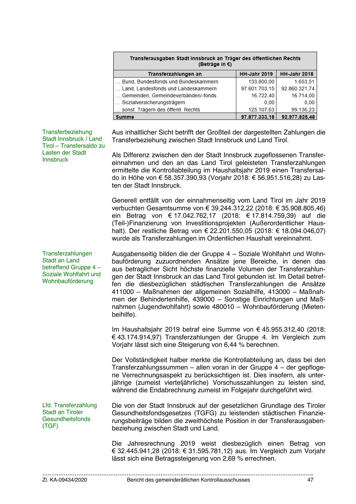 ermittelte die Kontrollabteilung im Haushaltsjahr 2019 einen Transfersaldo in Höhe von € 58.357.390,93 (Vorjahr 2018: € 56.951.516,28) zu Lasten der Stadt Innsbruck.