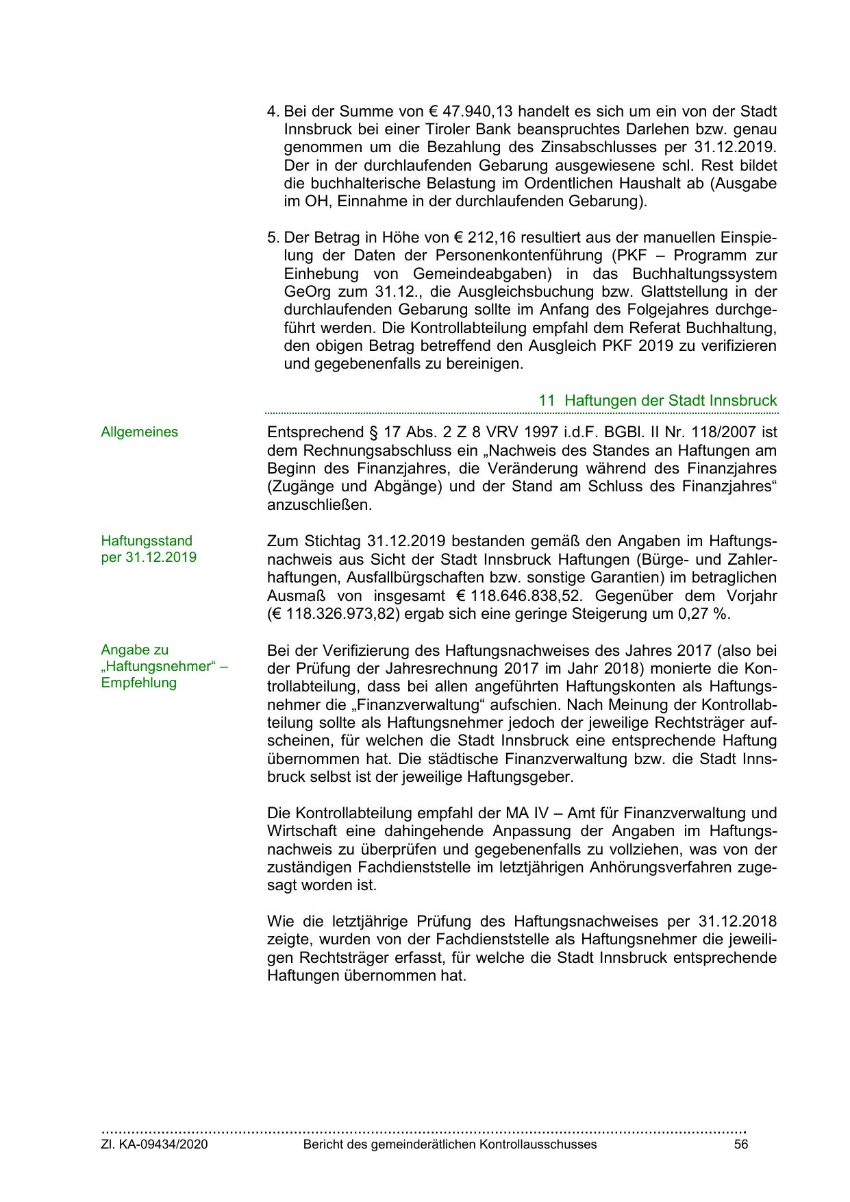 der Prüfung der Jahresrechnung 2017 im Jahr 2018) monierte die Kontrollabteilung, dass bei allen angeführten Haftungskonten als Haftungsnehmer die „Finanzverwaltung“ aufschien. Nach Meinung der Kontrollabteilung sollte als Haftungsnehmer jedoch der jeweilige Rechtsträger aufscheinen, für welchen die Stadt Innsbruck eine entsprechende Haftung