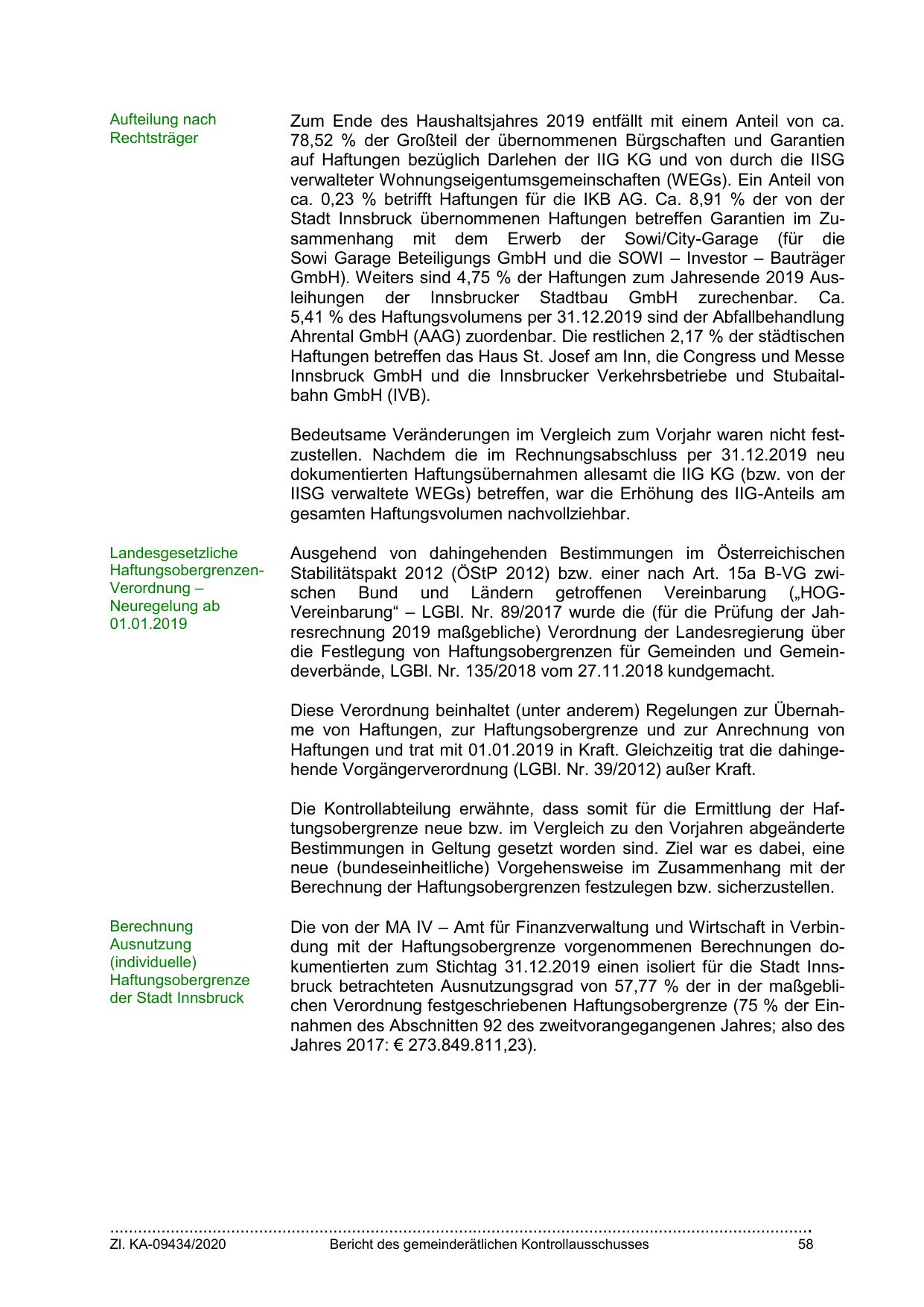 Die von der MA IV – Amt für Finanzverwaltung und Wirtschaft in Verbindung mit der Haftungsobergrenze vorgenommenen Berechnungen dokumentierten zum Stichtag 31.12.2019 einen isoliert für die Stadt Innsbruck betrachteten Ausnutzungsgrad von 57,77 % der in der maßgeblichen Verordnung festgeschriebenen Haftungsobergrenze (75 % der Einnahmen des Abschnitten 92 des zweitvorangegangenen Jahres; also des
