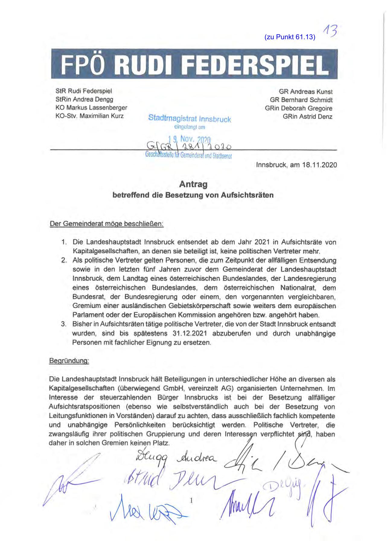 1. Die Landeshauptstadt Innsbruck entsendet ab dem Jahr 2021 in Aufsichtsräte von