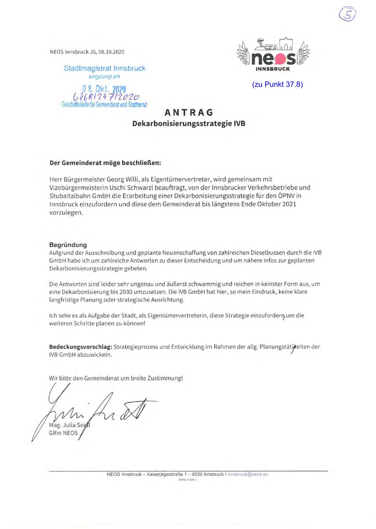 Innsbruck einzufordern und diese dem Gemeinderat bis längstens Ende Oktober 2021
