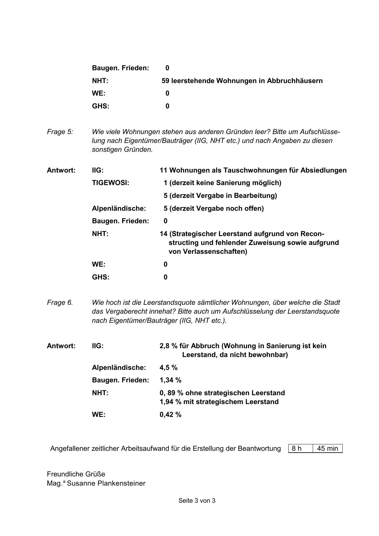 Angefallener zeitlicher Arbeitsaufwand für die Erstellung der Beantwortung