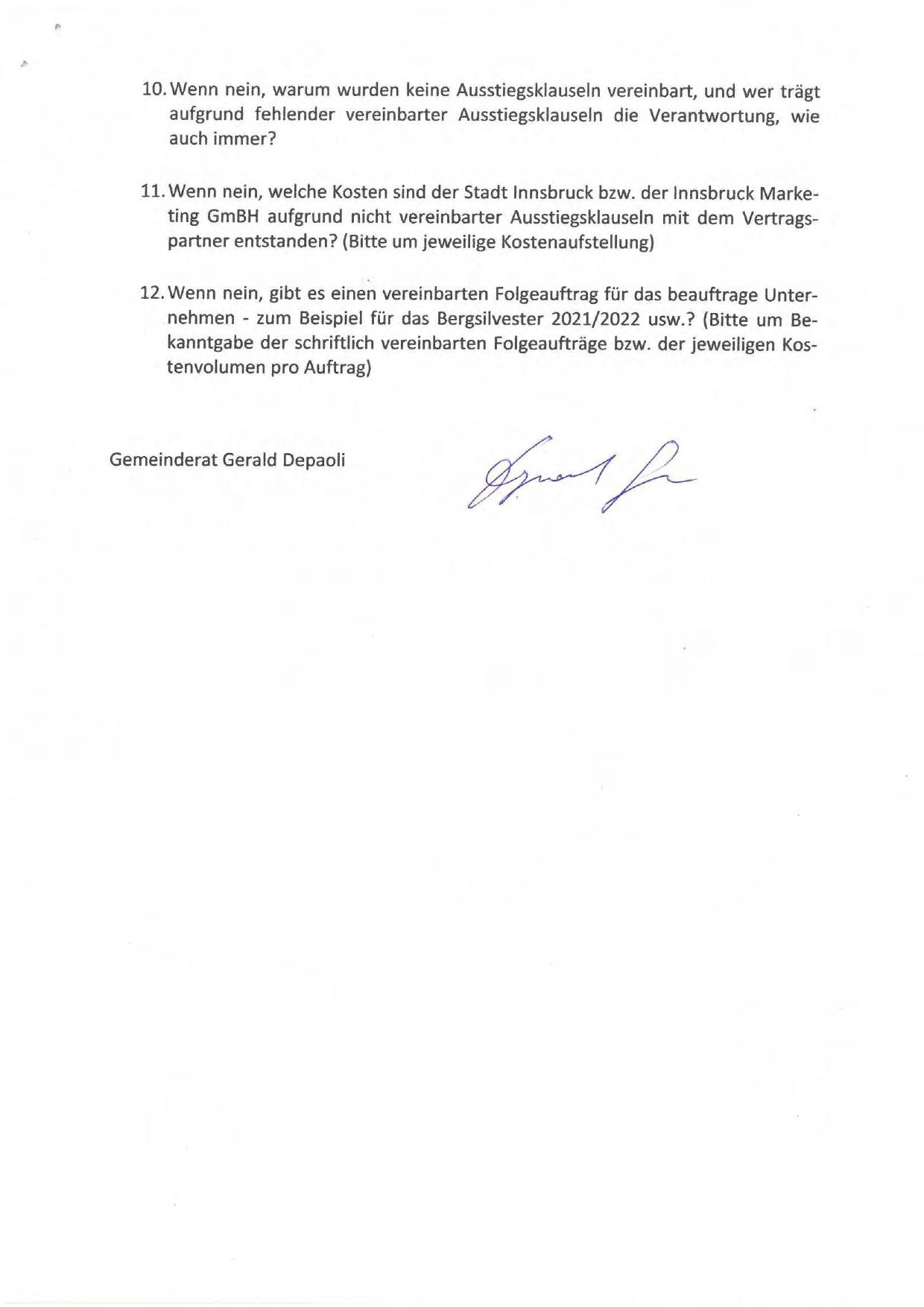 12. Wenn nein, gibt es einen vereinbarten Folgeauftrag für das beauftrage Unternehmen - zum Beispiel für das Bergsilvester 2021/2022 usw.? (Bitte um Bekanntgabe der schriftlich vereinbarten Folgeaufträge bzw. der jeweiligen Kostenvolumen pro Auftrag)