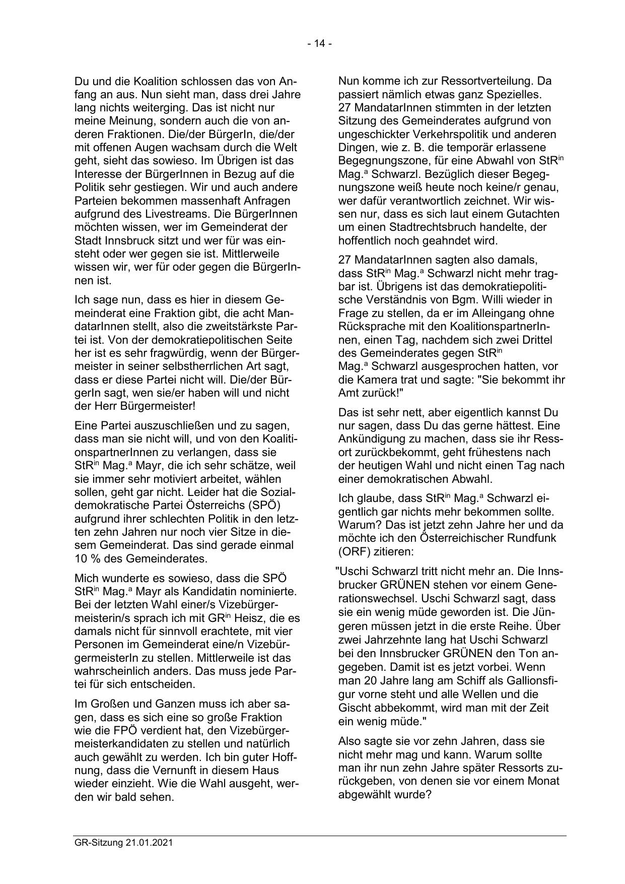 dass StRin Mag.a Schwarzl nicht mehr tragbar ist. Übrigens ist das demokratiepolitische Verständnis von Bgm. Willi wieder in