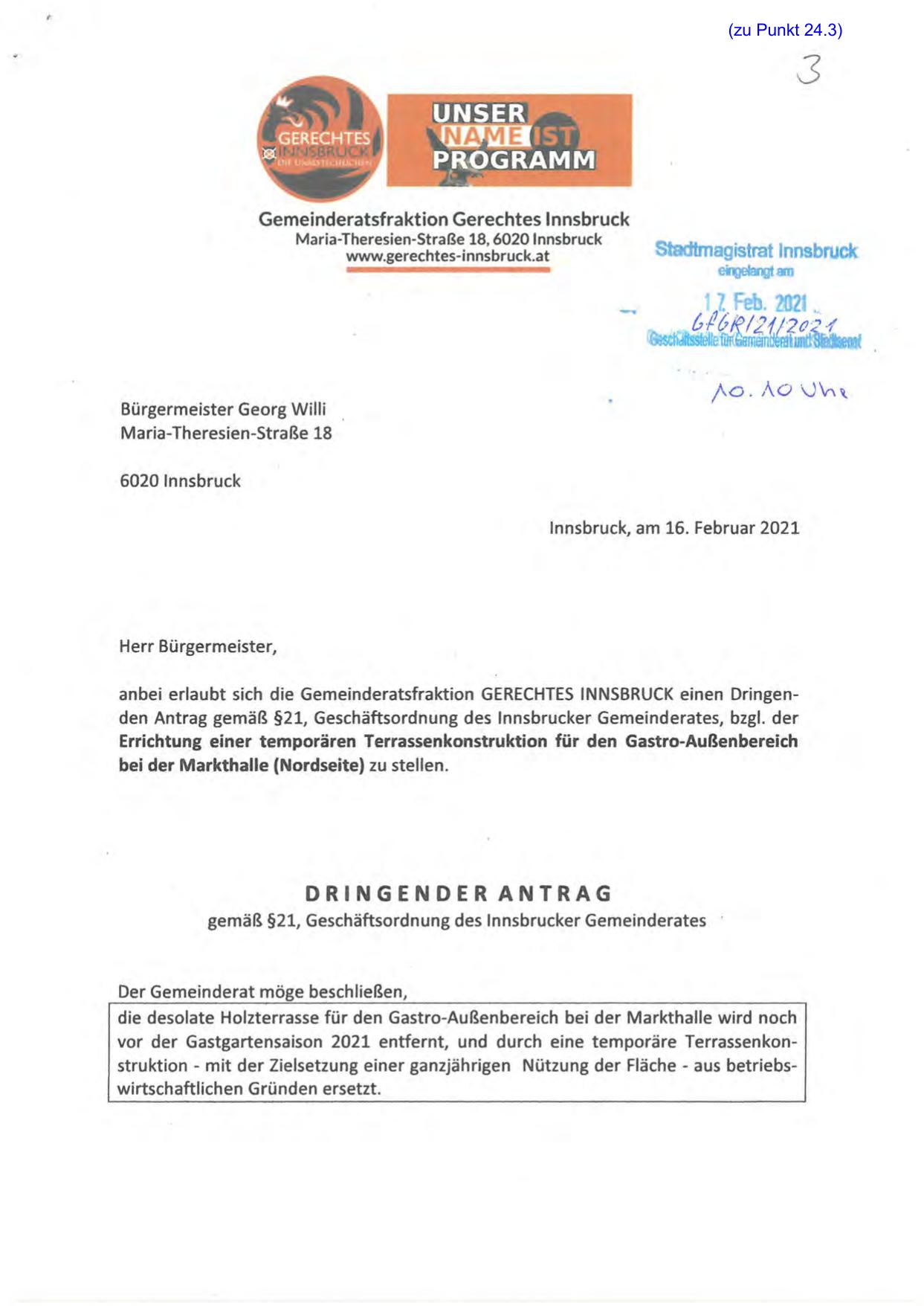 anbei erlaubt sich die Gemeinderatsfraktion GERECHTES INNSBRUCK einen Dringenden Antrag gemäß §21, Geschäftsordnung des lnnsbrucker Gemeinderates, bzgl. der