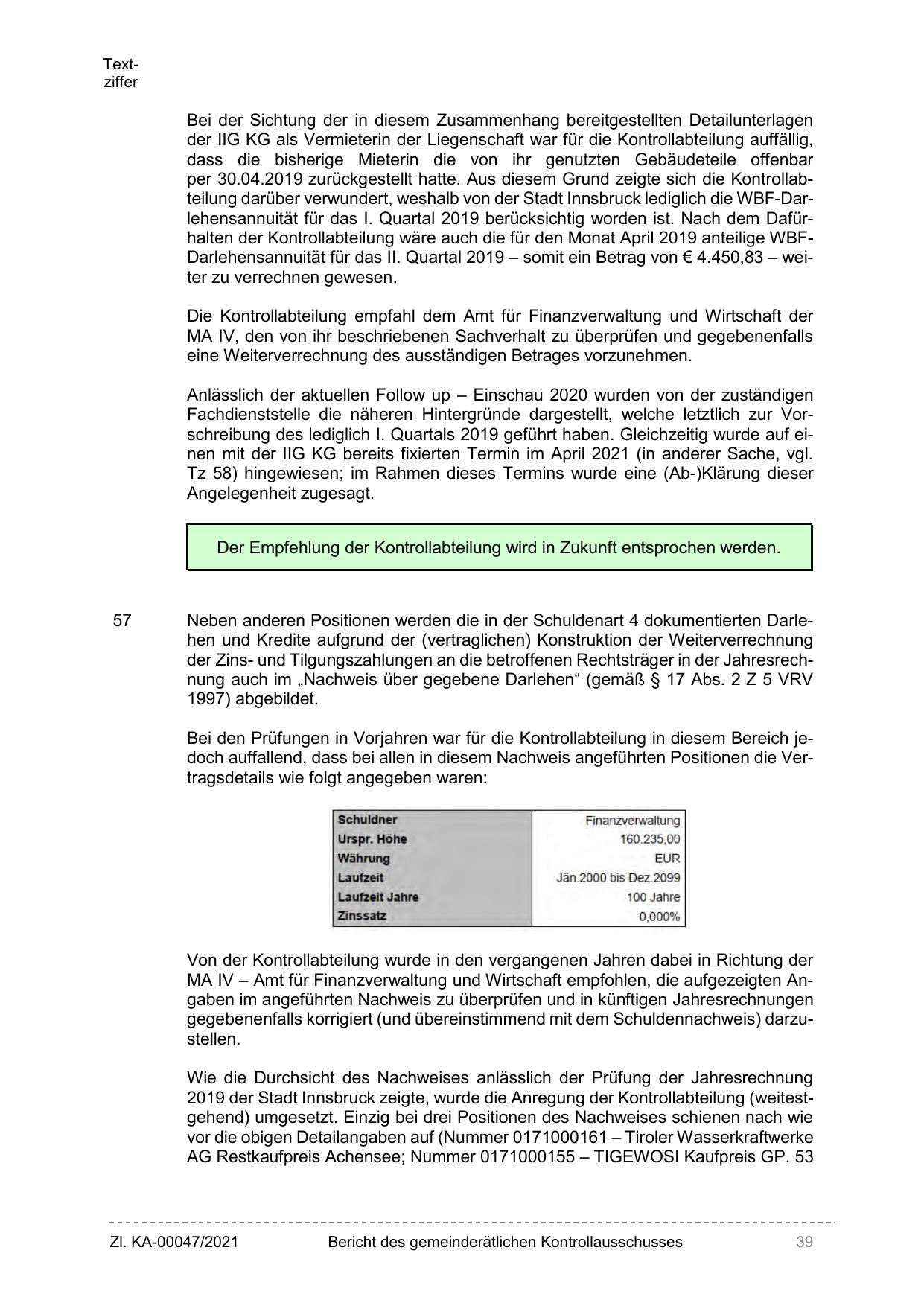 2019 der Stadt Innsbruck zeigte, wurde die Anregung der Kontrollabteilung (weitestgehend) umgesetzt. Einzig bei drei Positionen des Nachweises schienen nach wie