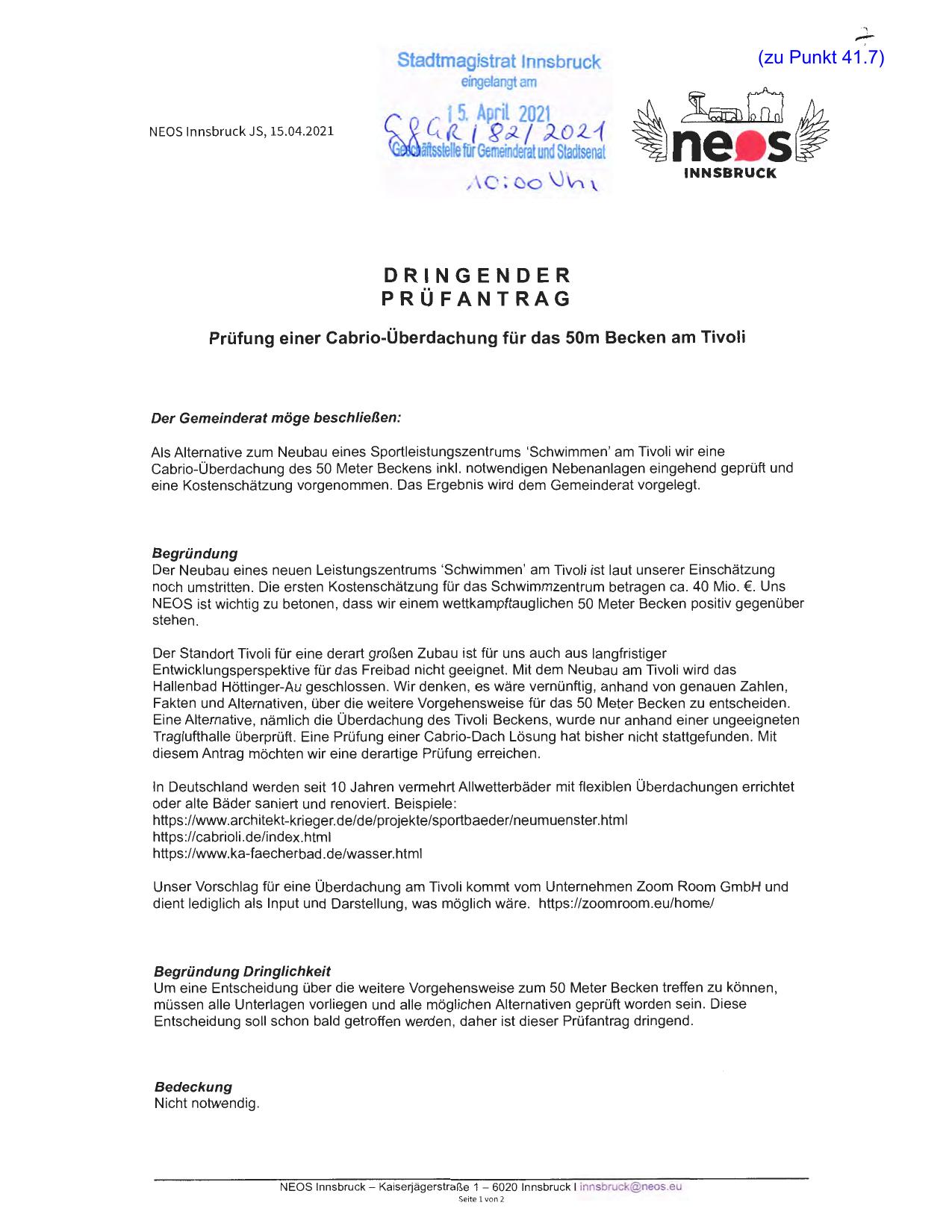 NEOS ist wichtig zu betonen , dass wir einem wettkampftauglichen 50 Meter Becken positiv gegenüber