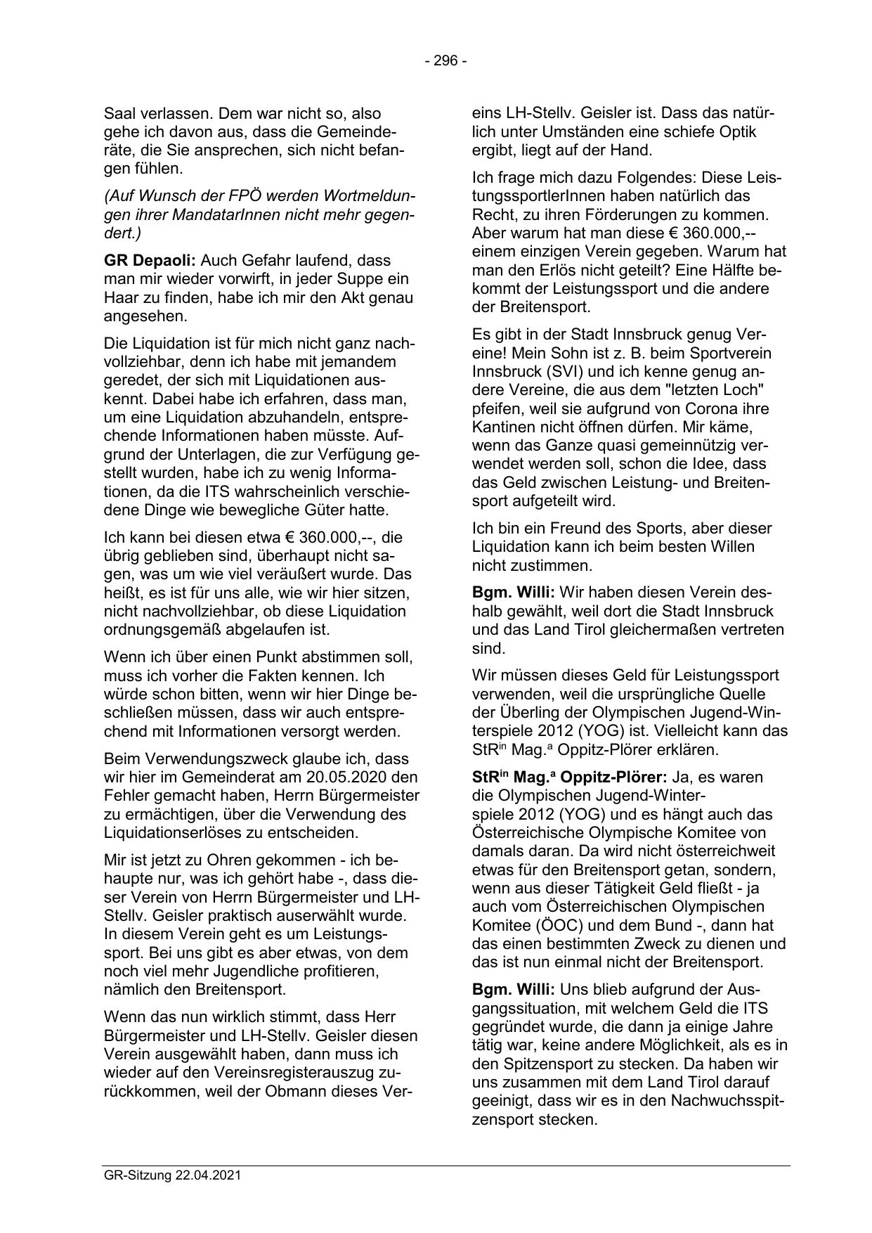 (Auf Wunsch der FPÖ werden Wortmeldungen ihrer MandatarInnen nicht mehr gegendert.)