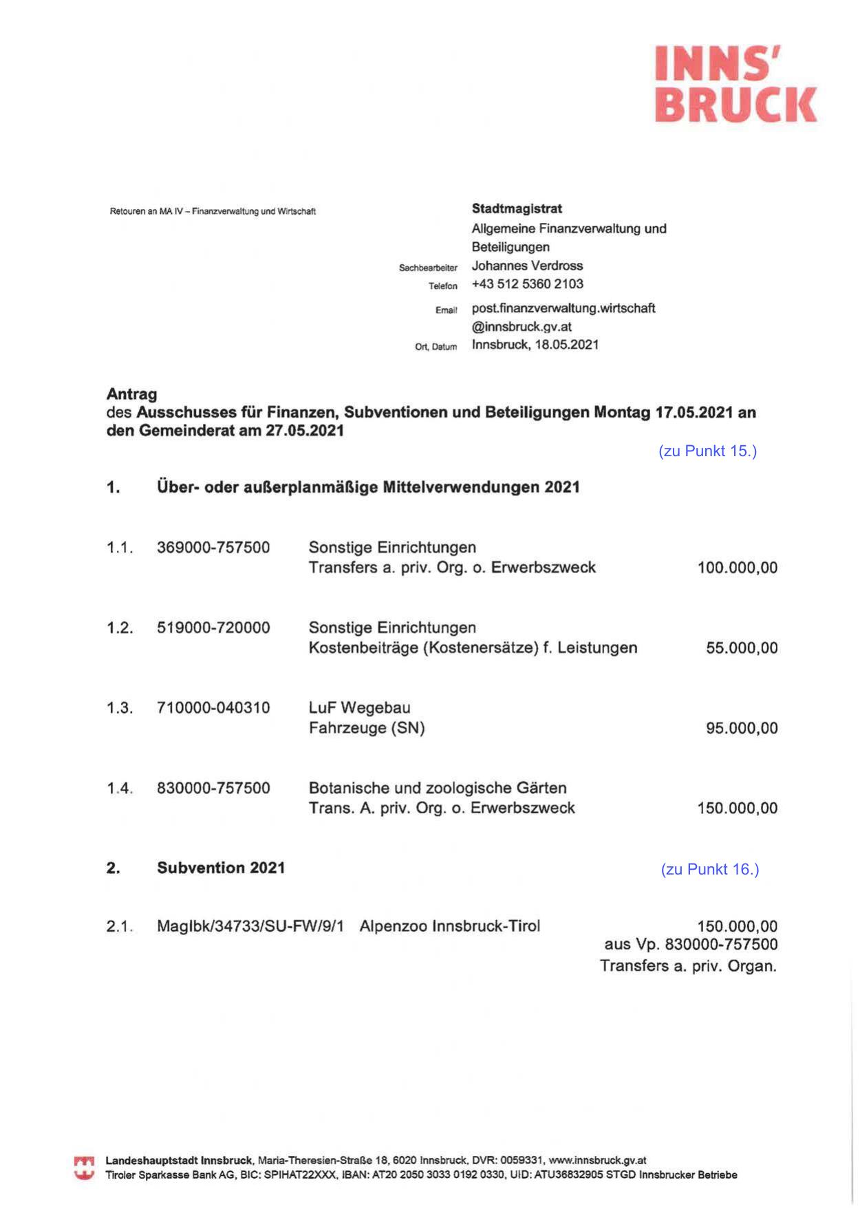 Tiroler Sparkasse Bank AG, BIC: SPIHAT22XXX, IBAN: AT20 2050 3033 0192 0330, UID: ATU36832905 STGD lnnsbrucker Betriebe