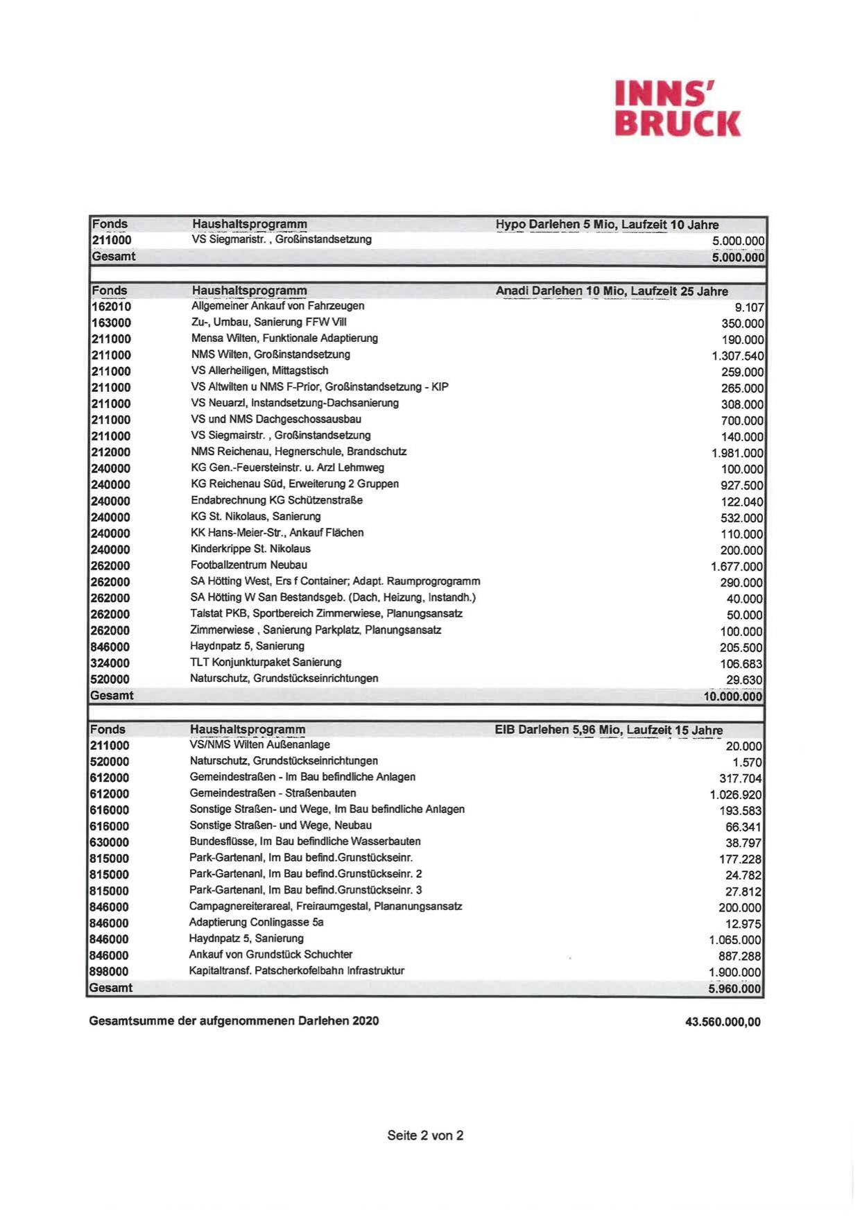Gesamtsumme der aufgenommenen Darlehen 2020